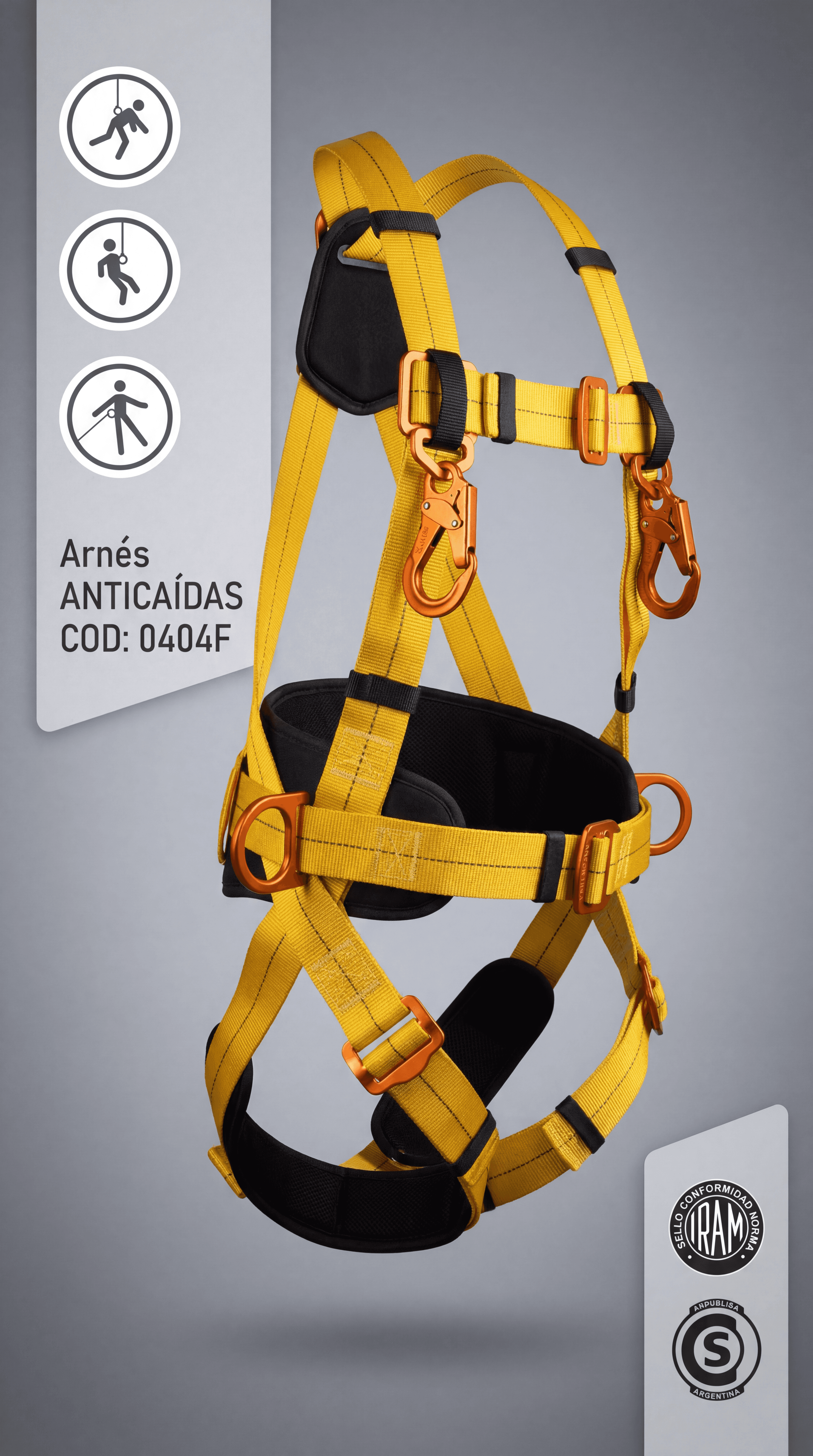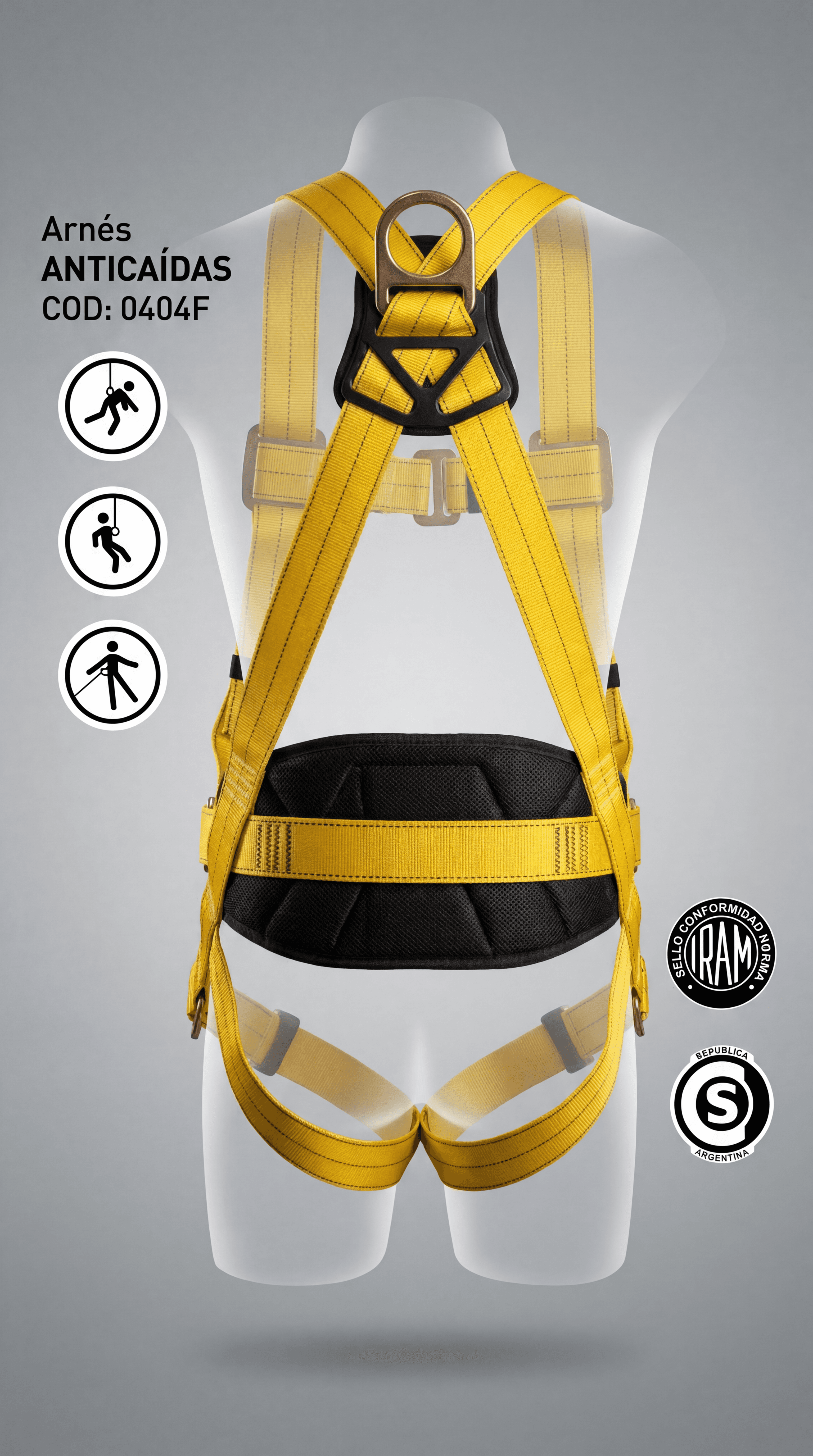 Arnés anticaídas de cuerpo completo confeccionado en cinta de poliéster de alta tenacidad color amarillo con acolchado lumbar y pectoral en negro. Diseñado para protección contra caídas en trabajos en altura, posicionamiento y rescate. Cuenta con punto de anclaje dorsal tipo argolla en D, hebillas de ajuste en hombros, cintura y piernas, y mosquetones de conexión rápida en los laterales. Certificado bajo norma IRAM y habilitado por SRT Argentina.