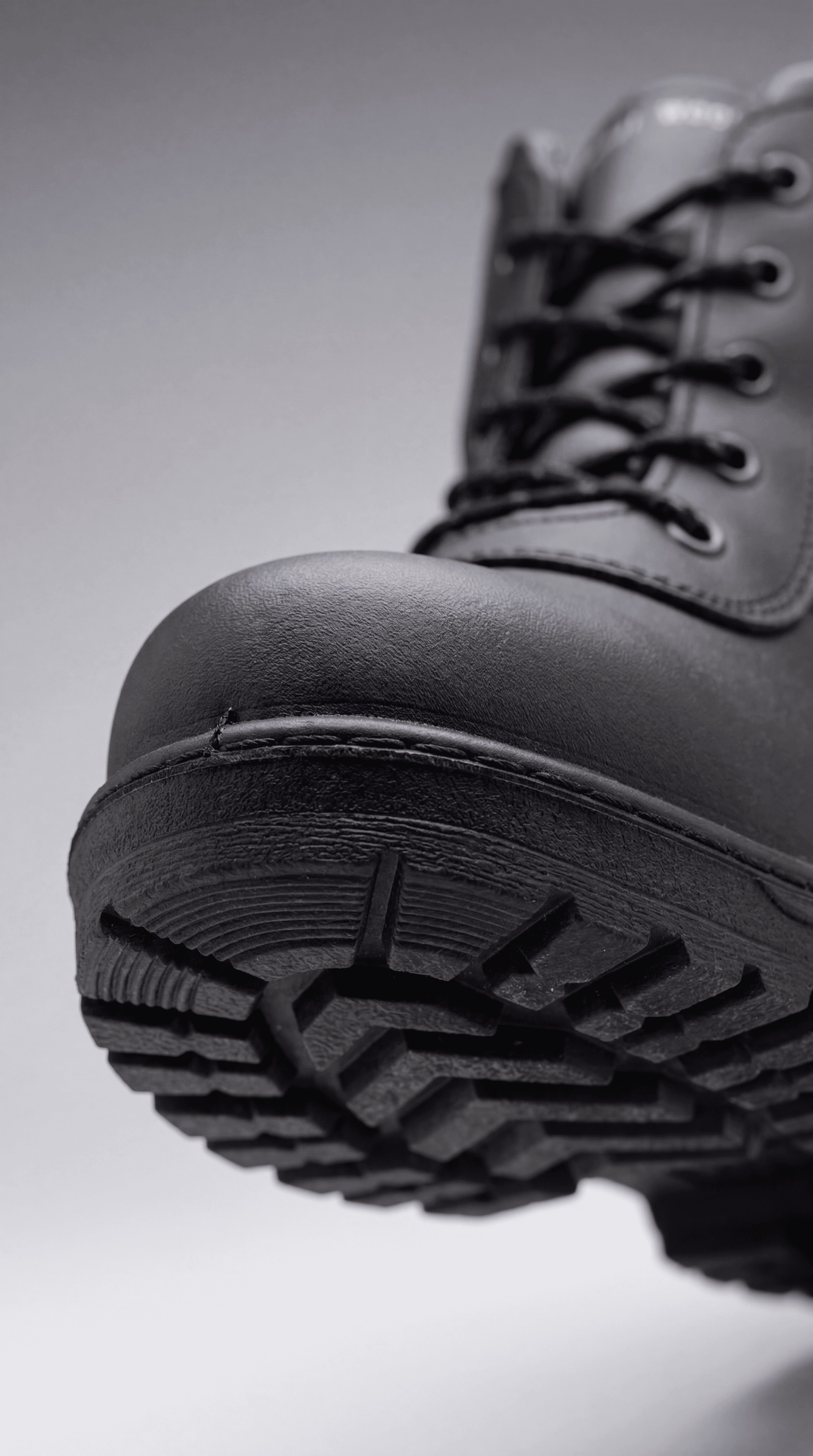 Botín de seguridad confeccionado íntegramente en cuero liso negro de alta resistencia. Su diseño clásico y funcional lo convierte en una opción versátil para múltiples entornos laborales. Incorpora sistema de cierre mediante cordones con ojales metálicos, puntera reforzada de seguridad y suela de goma negra con taco tipo lug para tracción y amortiguación en superficies irregulares.
