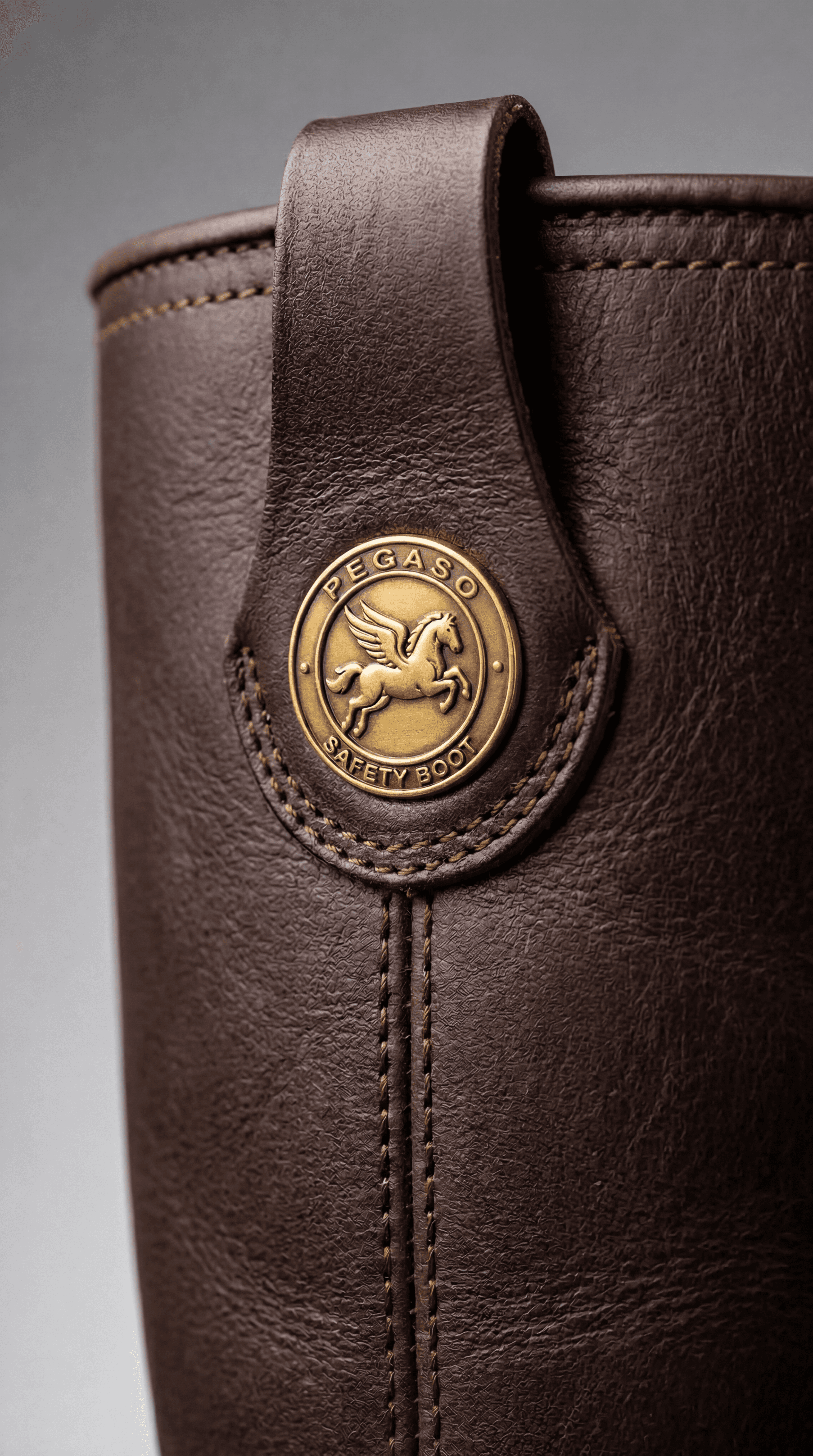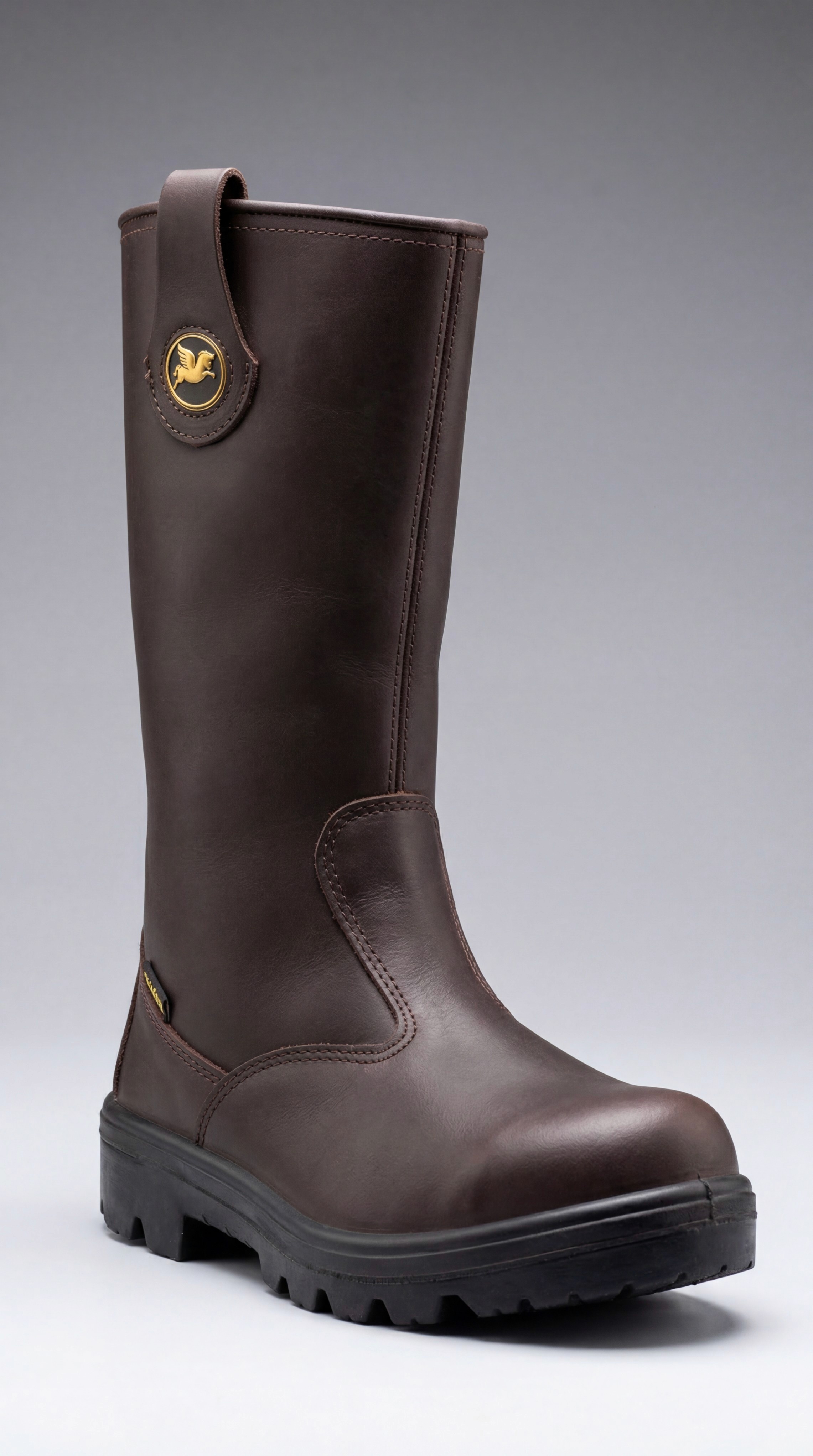 Bota de seguridad tipo rigger de caña alta confeccionada íntegramente en cuero vacuno marrón oscuro de alta resistencia. Su diseño sin cordones con caña rígida permite el calce y descalce rápido, ideal para entornos industriales donde la agilidad operativa es clave. La caña alta estructurada brinda soporte y protección completa del tobillo, mientras que su suela de goma negra de alto perfil garantiza tracción y amortiguación en superficies irregulares.