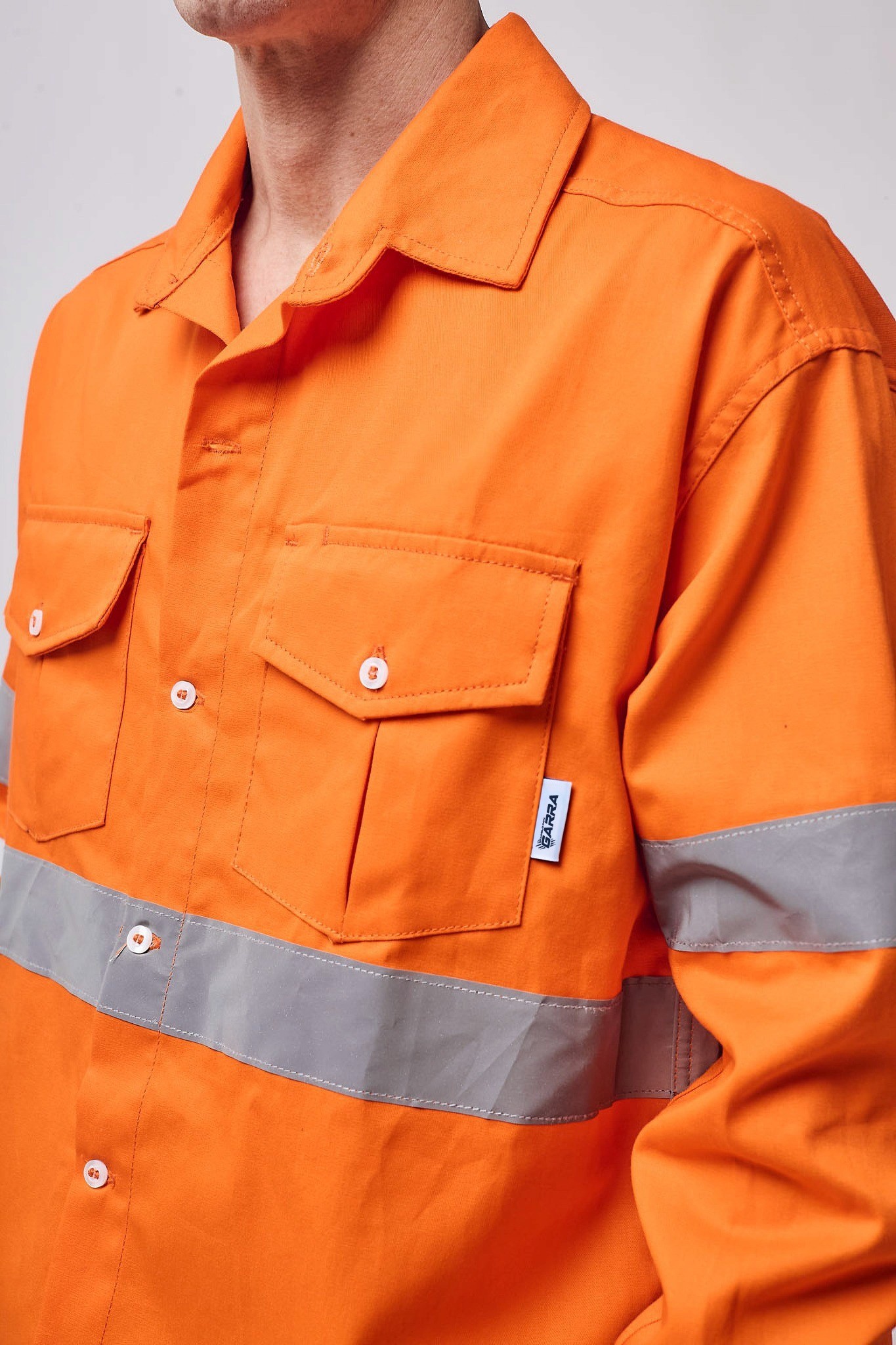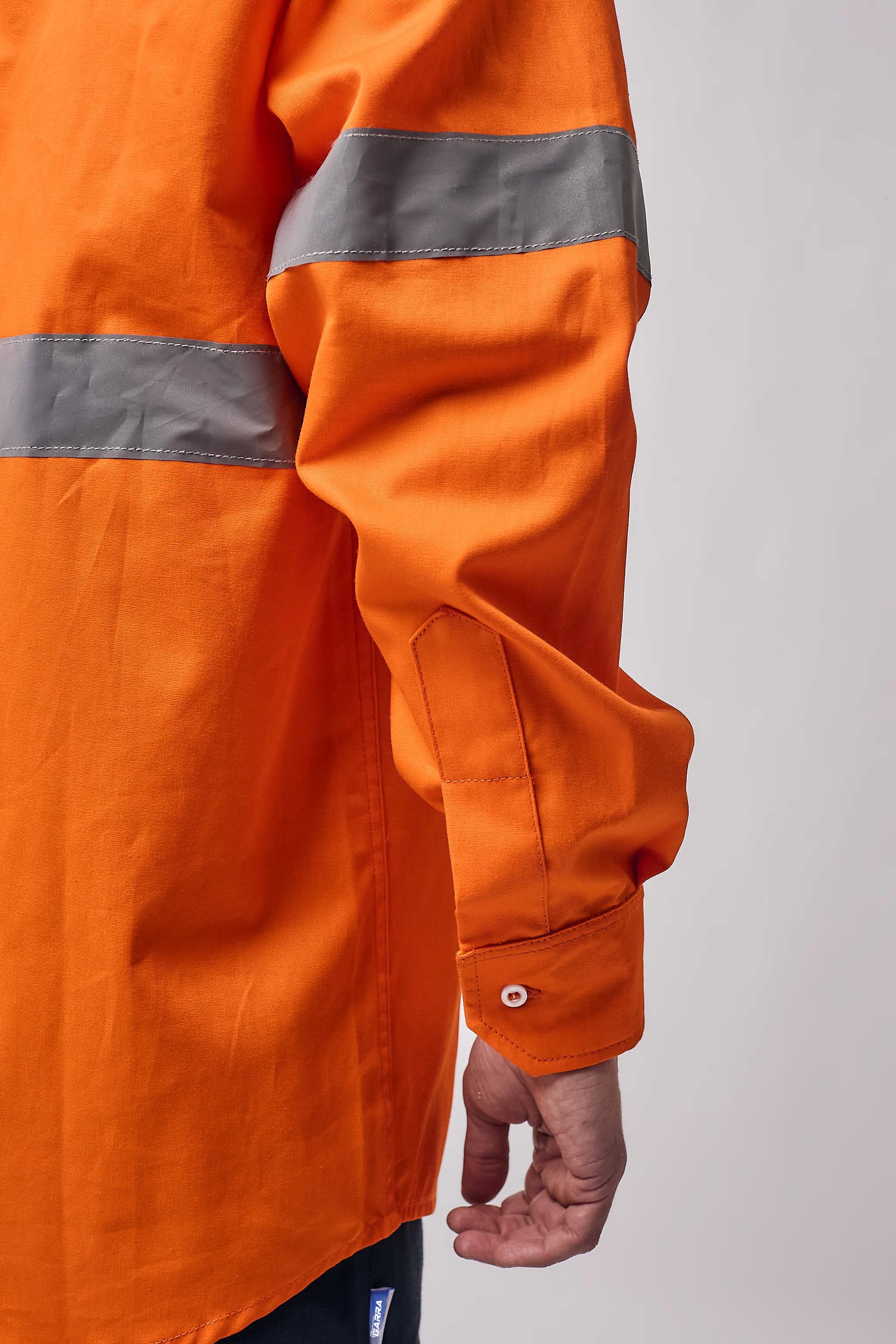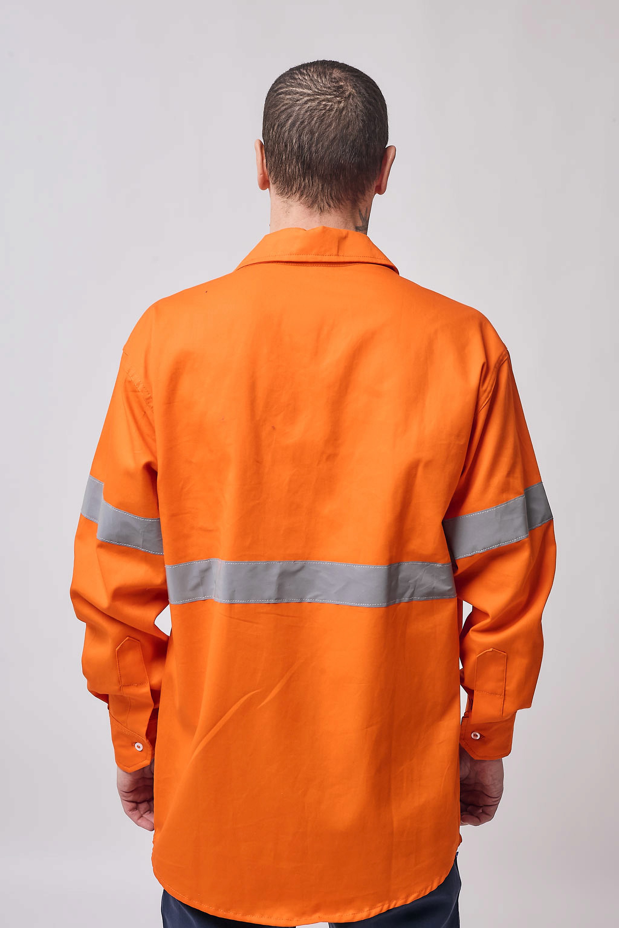 Camisa de trabajo con dos bolsillos superiores con tabla, tapa y botón, cartera frontal y puños con botones. Incorpora cinta reflectiva gris 360° en cintura y mangas para maximizar la visibilidad operativa. Su construcción resistente y su calce estable la convierten en una prenda confiable para tareas de alta demanda y uso prolongado.