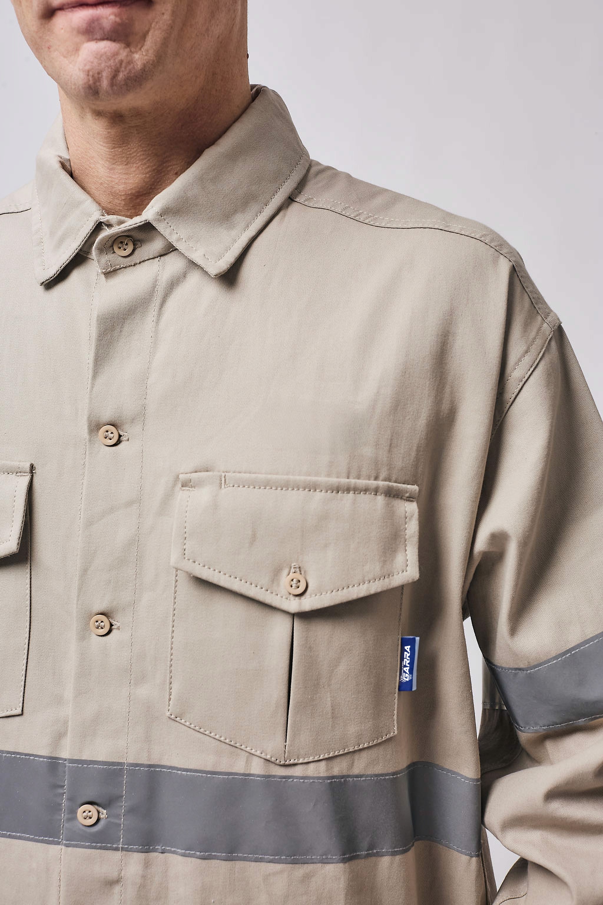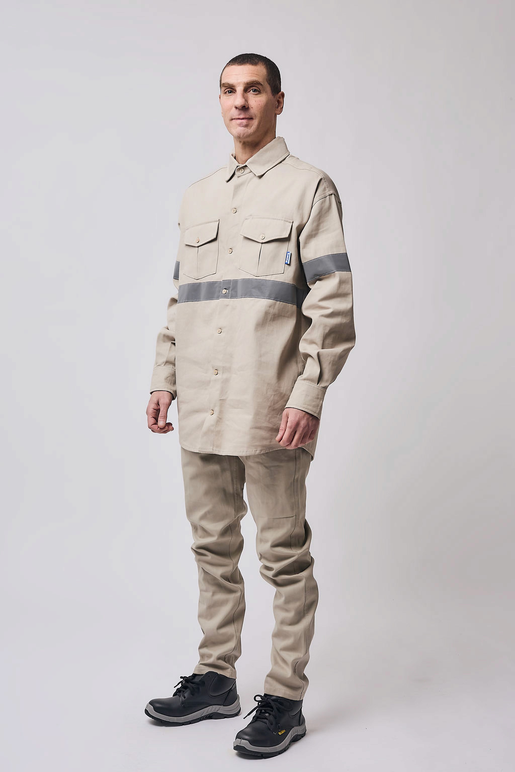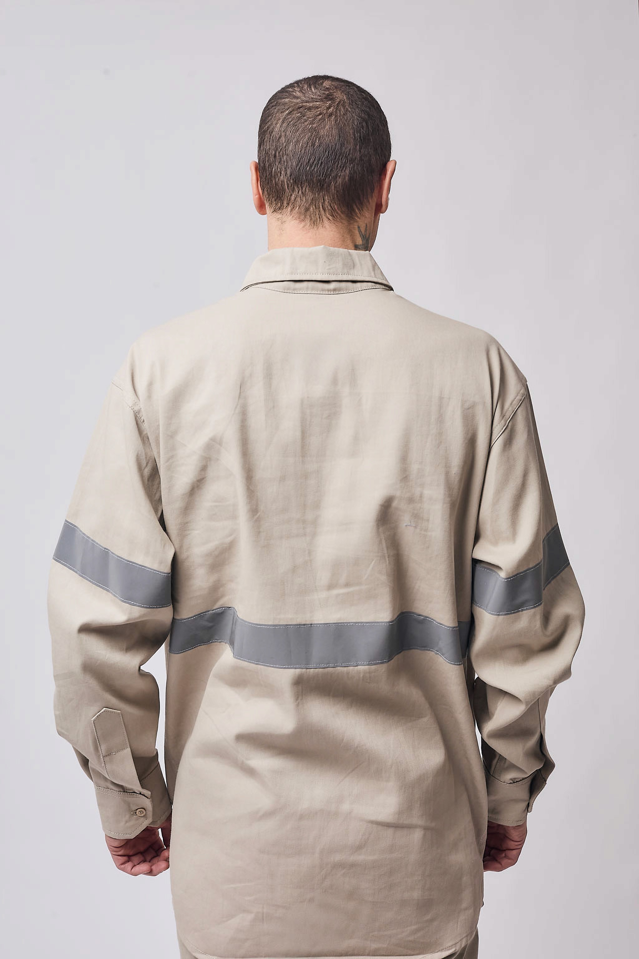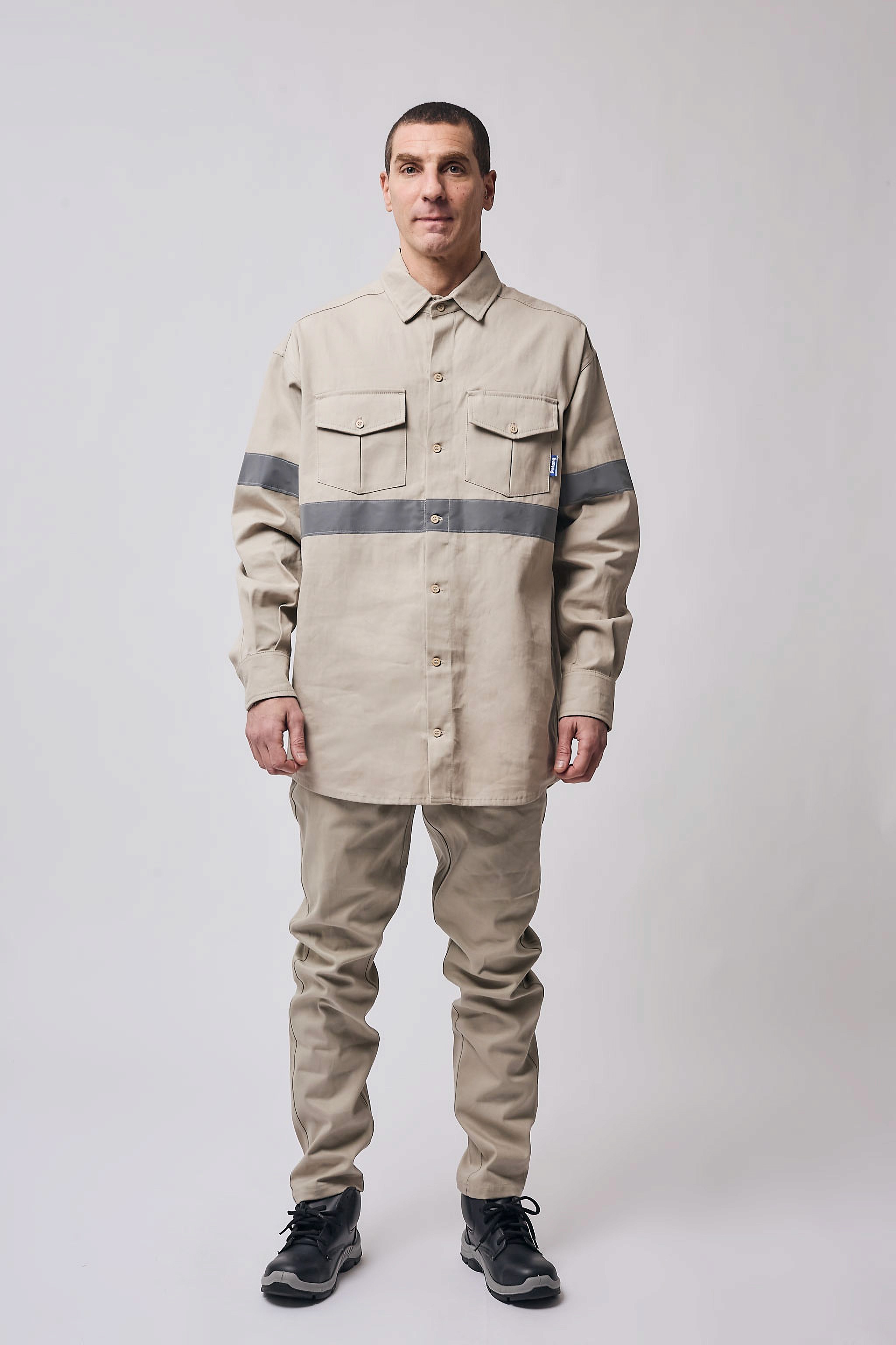 Camisa de trabajo de manga larga diseñada para ofrecer visibilidad y resistencia en entornos exigentes. Incorpora dos bolsillos delanteros con tapa y botón para almacenamiento seguro, una banda reflectiva gris de 360° en pecho y mangas que garantiza visibilidad en todas las direcciones, y un cierre frontal con cartera y botonadura completa que refuerza su estructura. Su confección robusta y su diseño funcional la convierten en una prenda confiable para jornadas prolongadas de uso laboral.