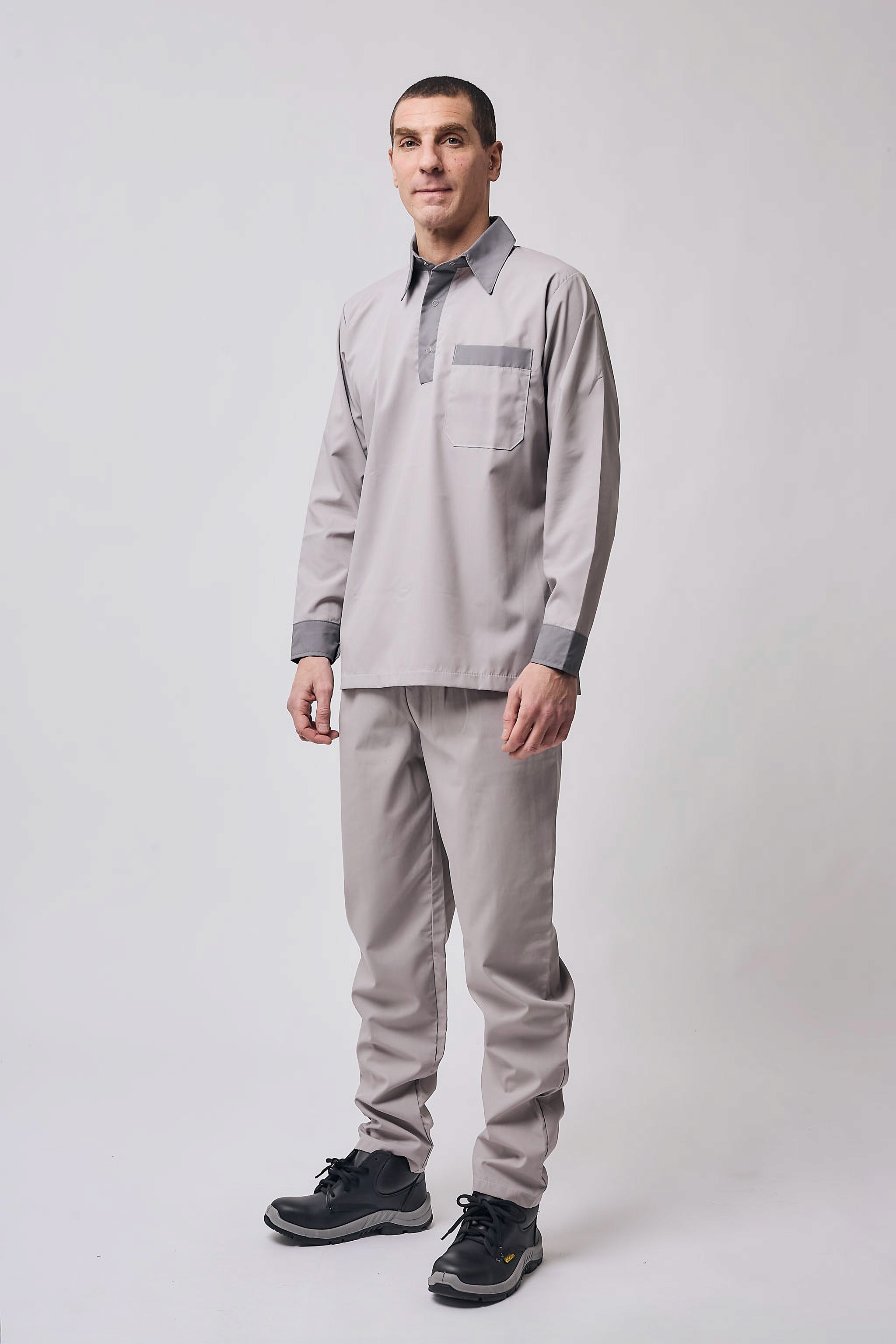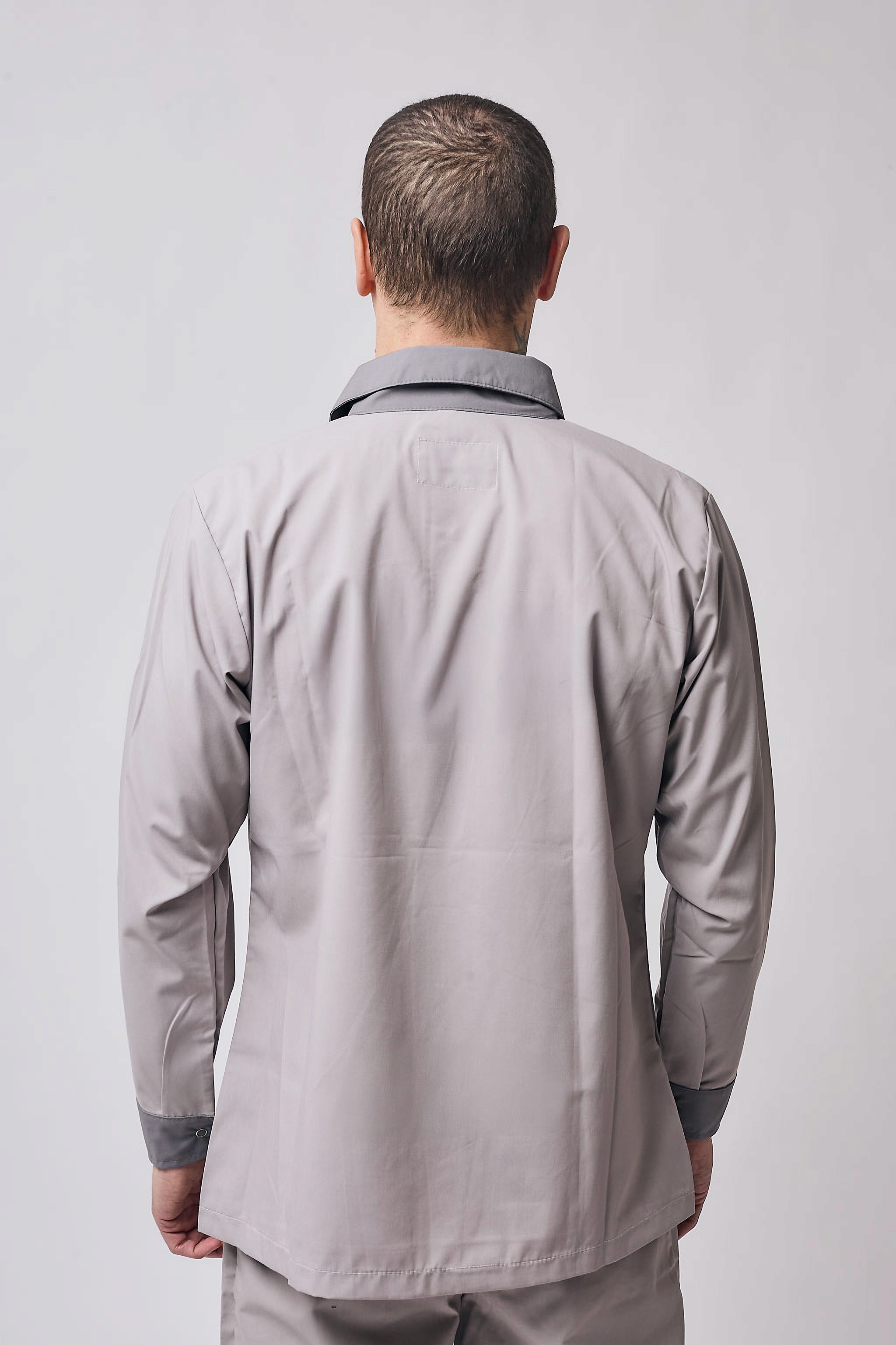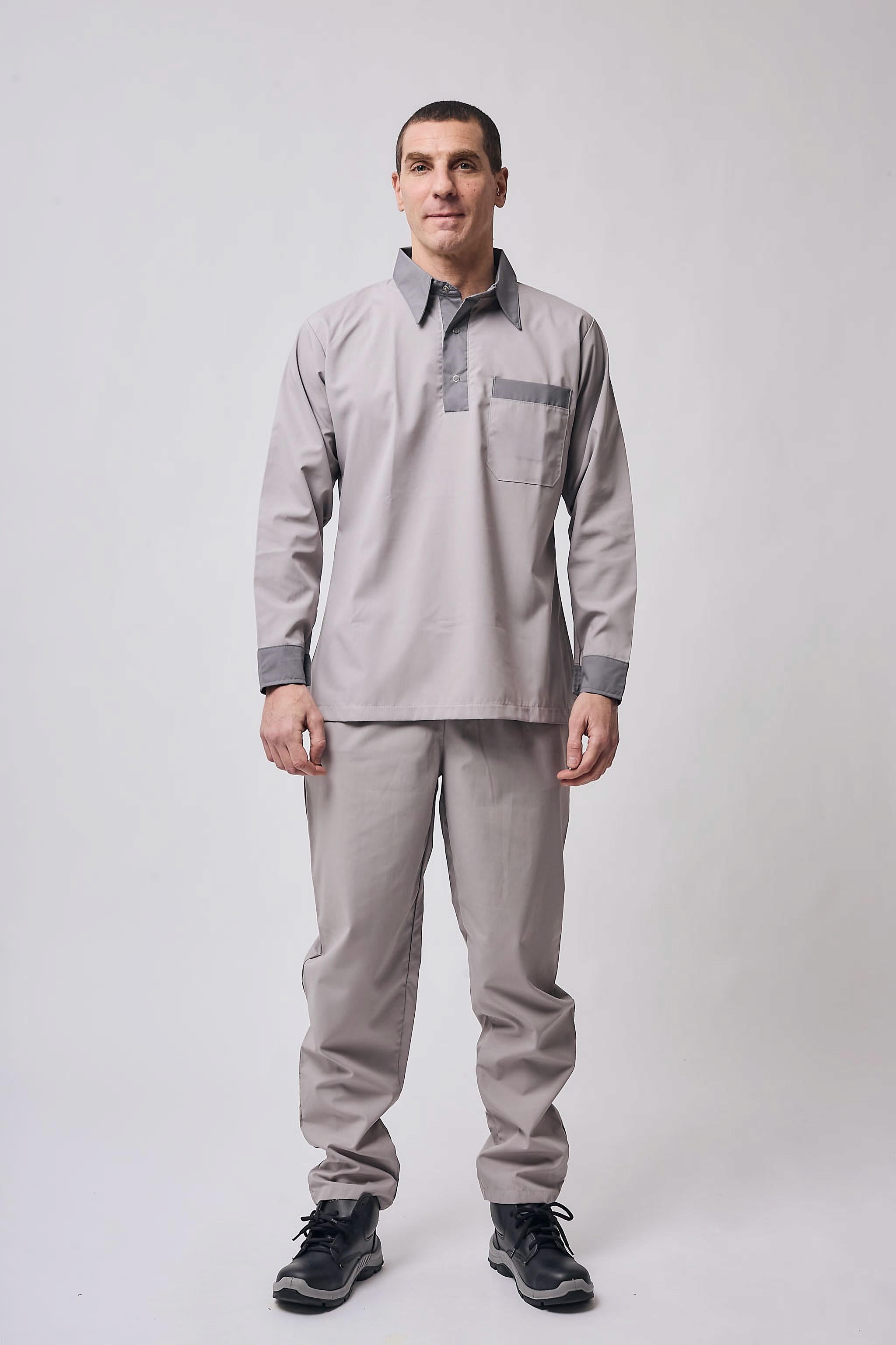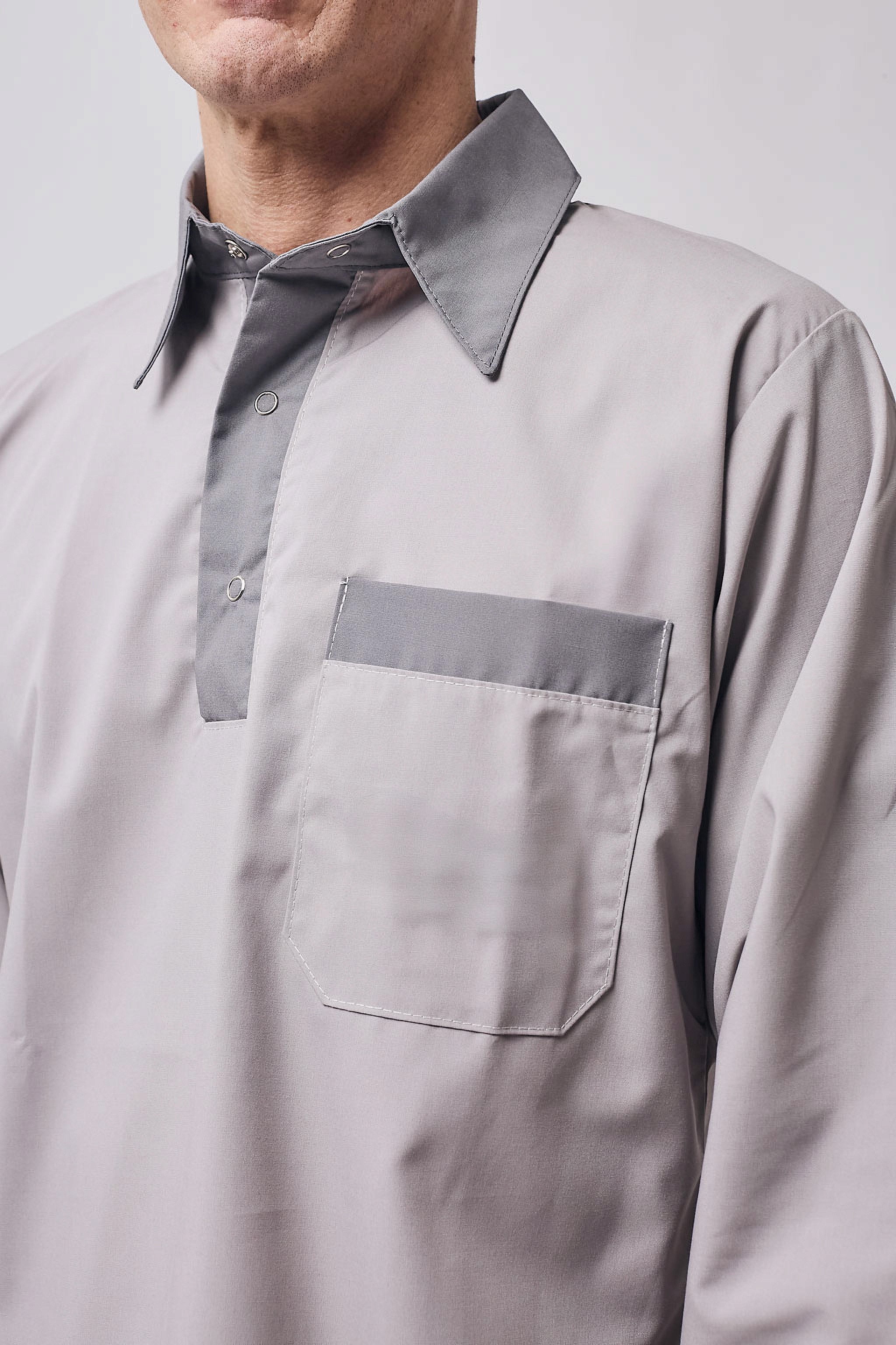 Camisa tipo ambo manga larga con cuello camisero y broches tipo snap en su escote. Bolsillo delantero aplicado. Diseño cómodo y resistente, ideal para uso laboral.