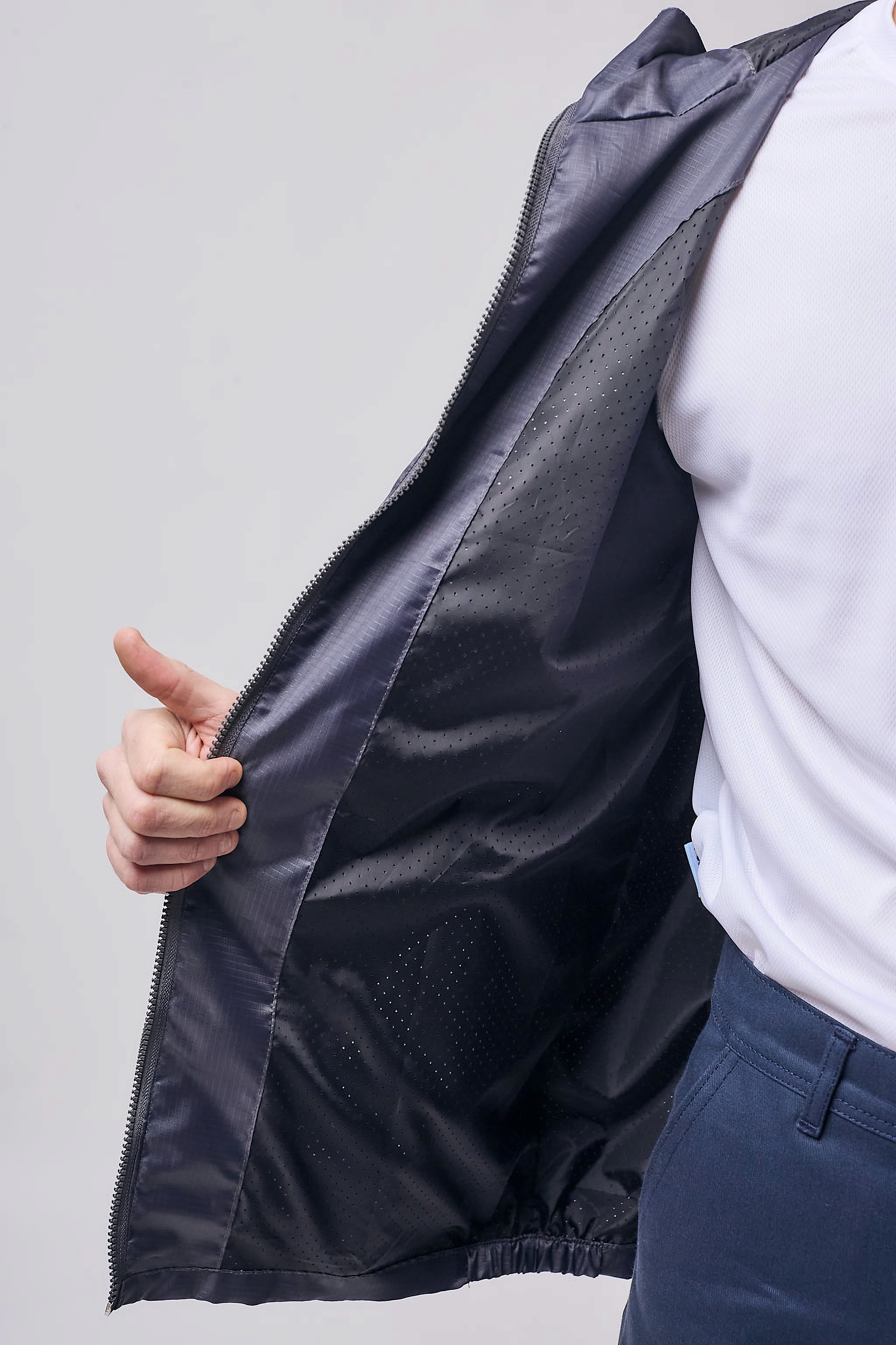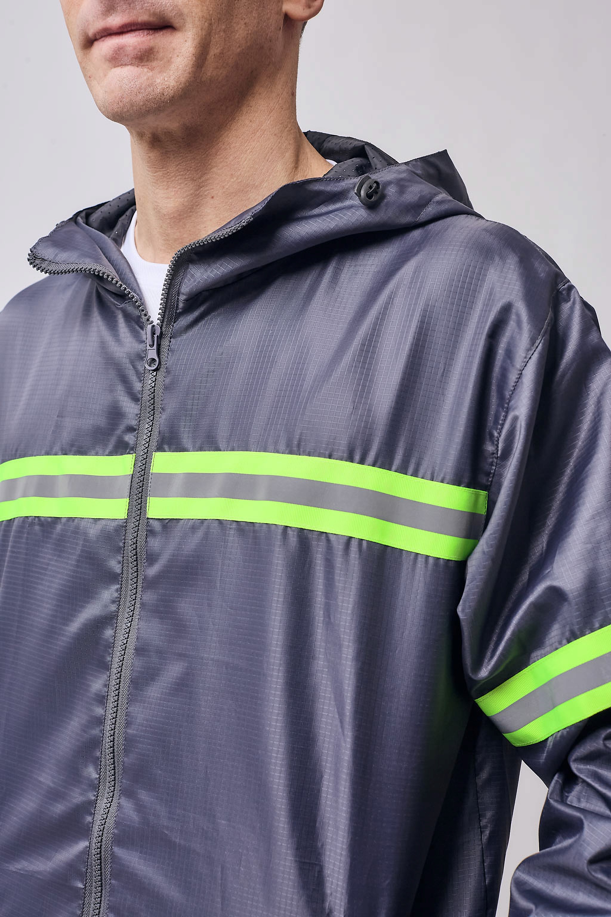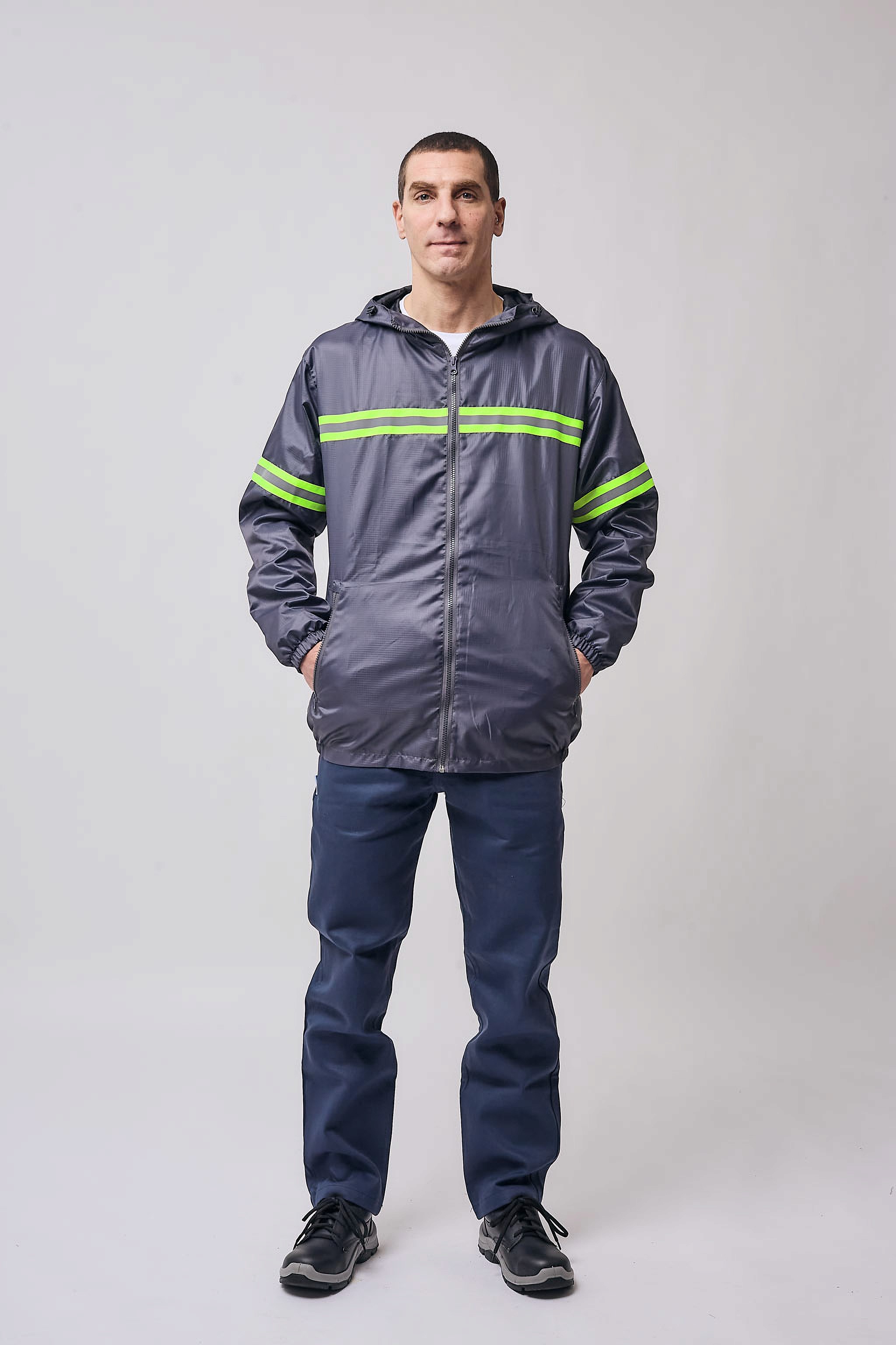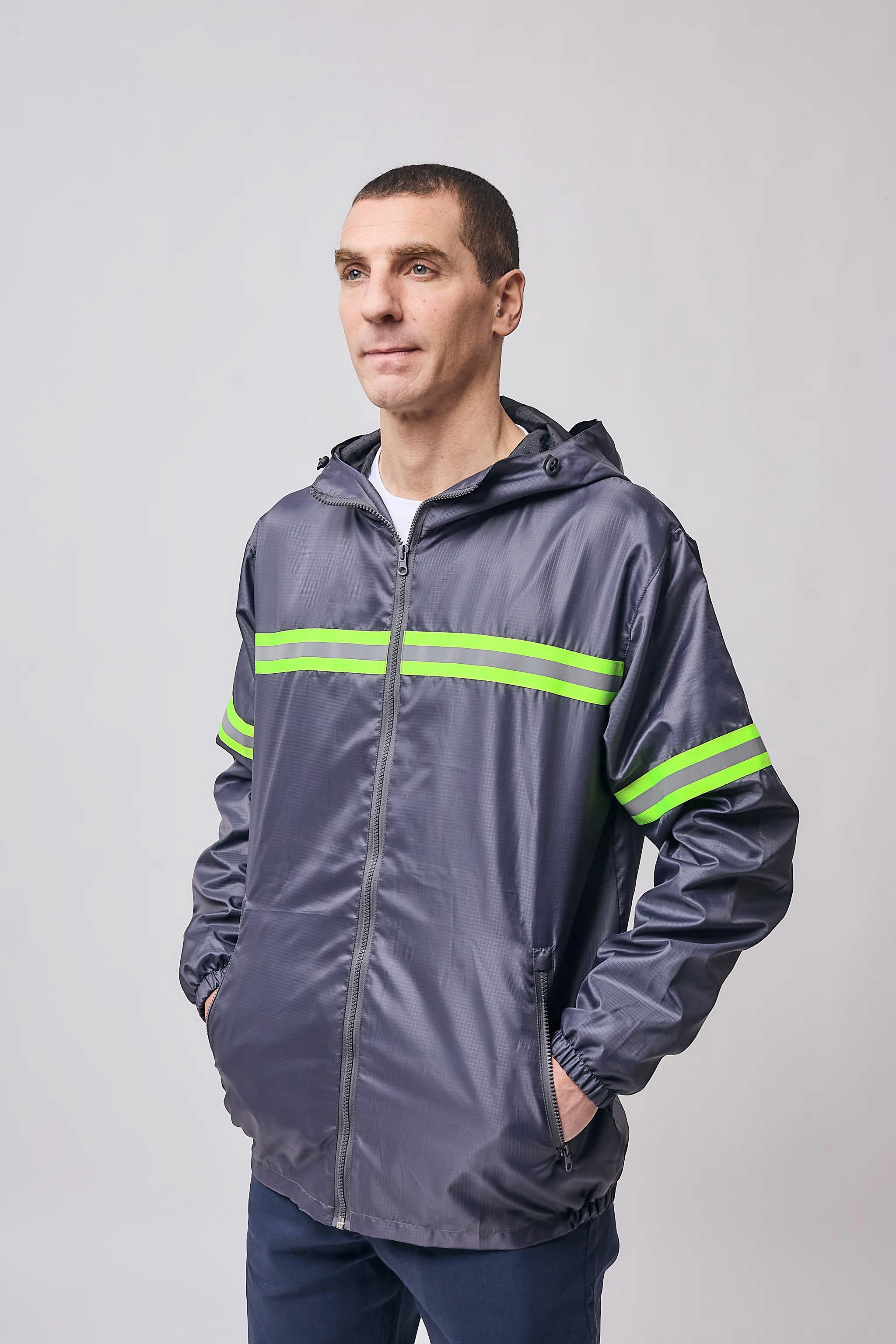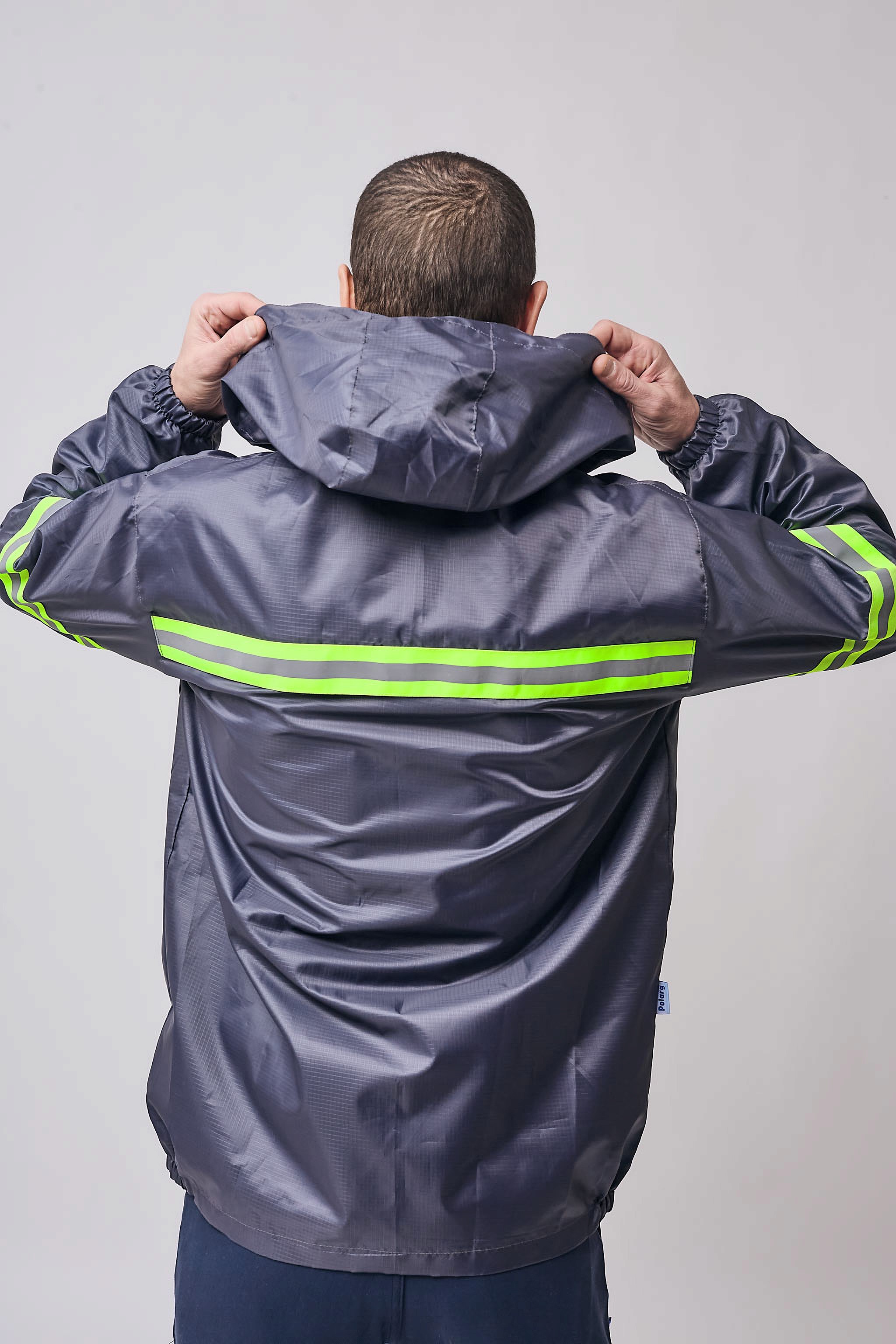 Campera rompevientos con cuello alto y capucha ajustable mediante tanca y cordón elástico. Presenta dos bolsillos frontales con cierre para guardado seguro. Puños elasticados y cintura regulable con tanca y cordón elástico. Incorpora cintas reflectivas gris 360° en mangas y cuerpo para visibilidad plena. Totalmente forrada en tela punch para mayor protección y confort.