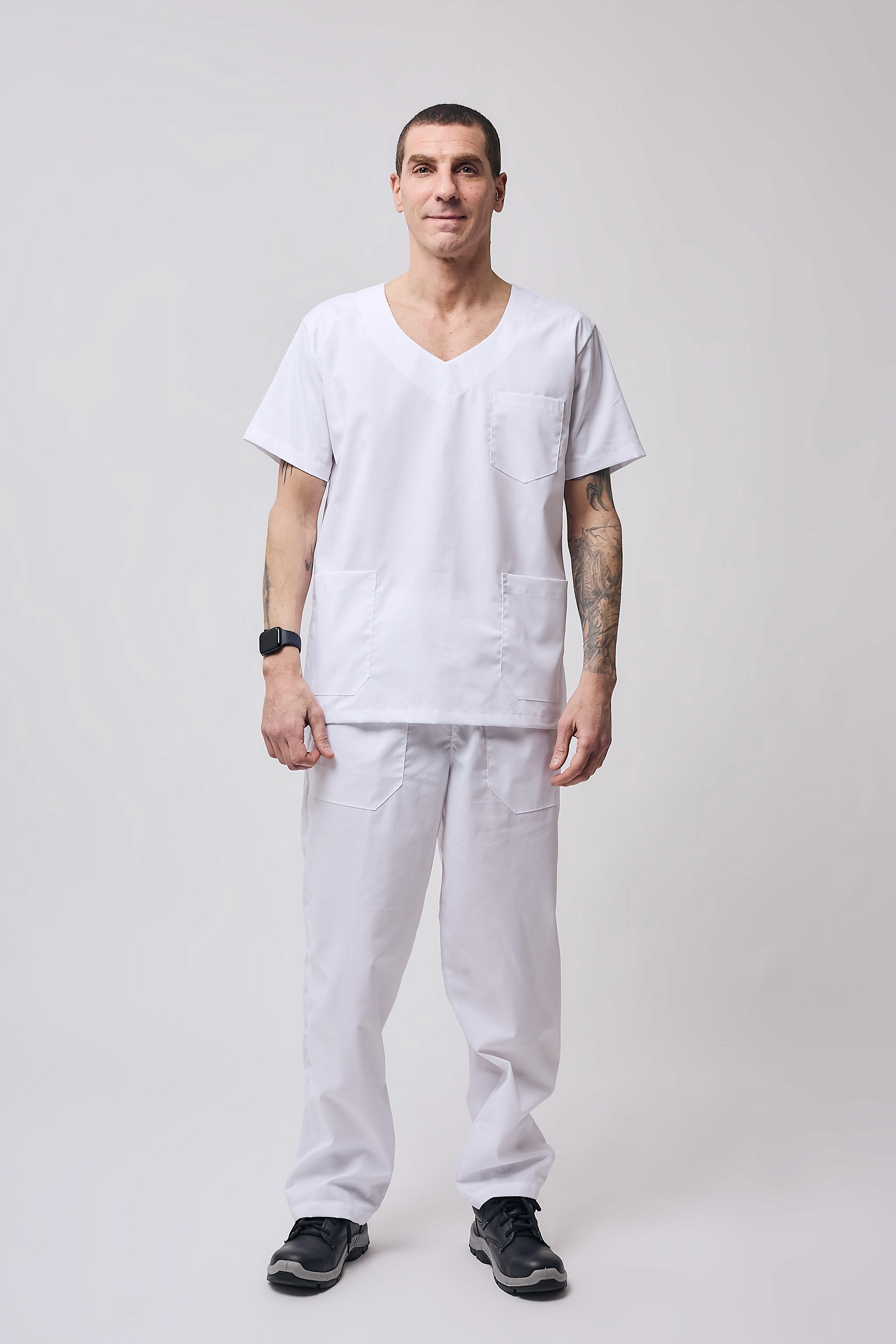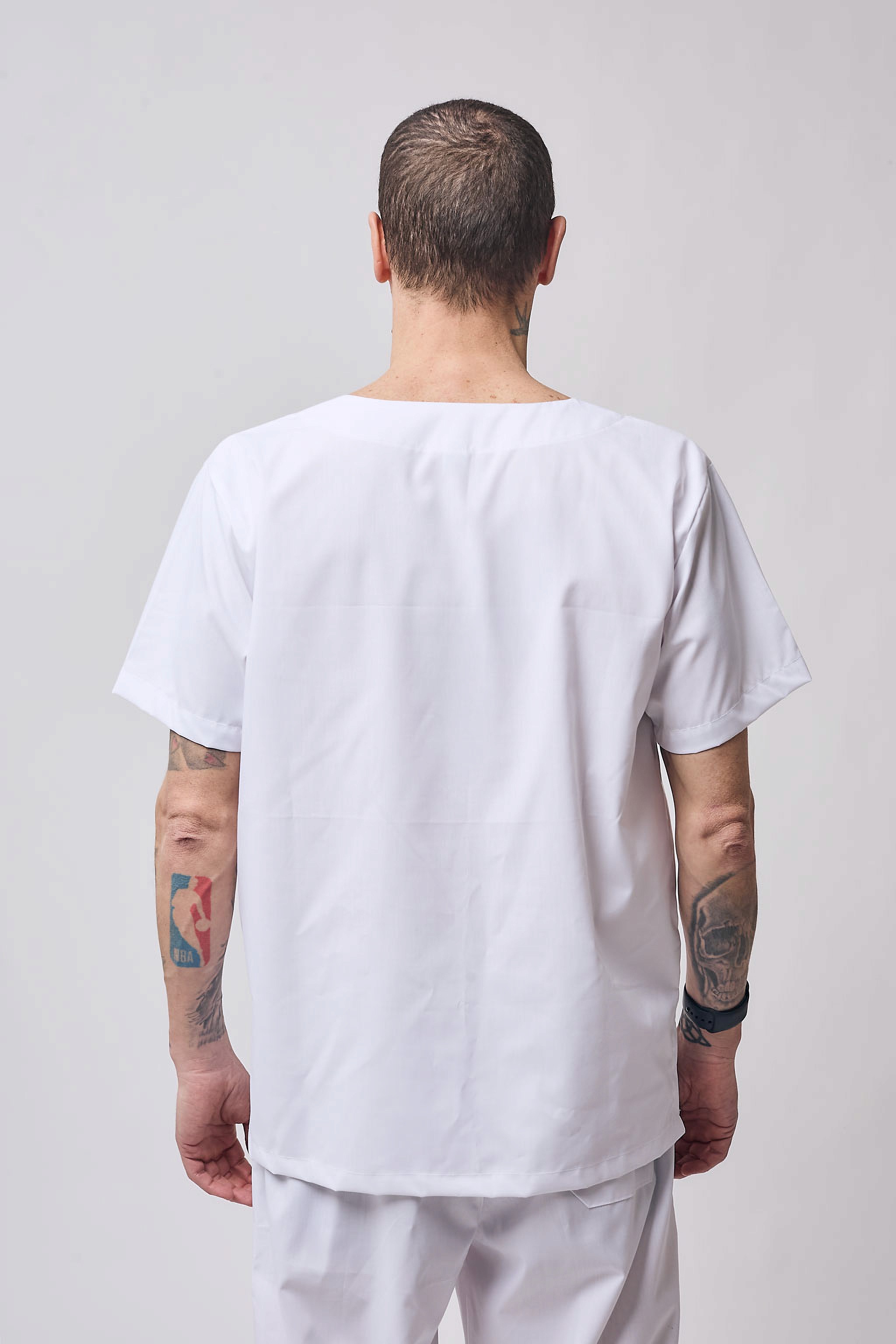Chaqueta de ambo manga corta con escote en V, dos bolsillos bajos y un bolsillo superior. Diseño cómodo y funcional, ideal para uso profesional.