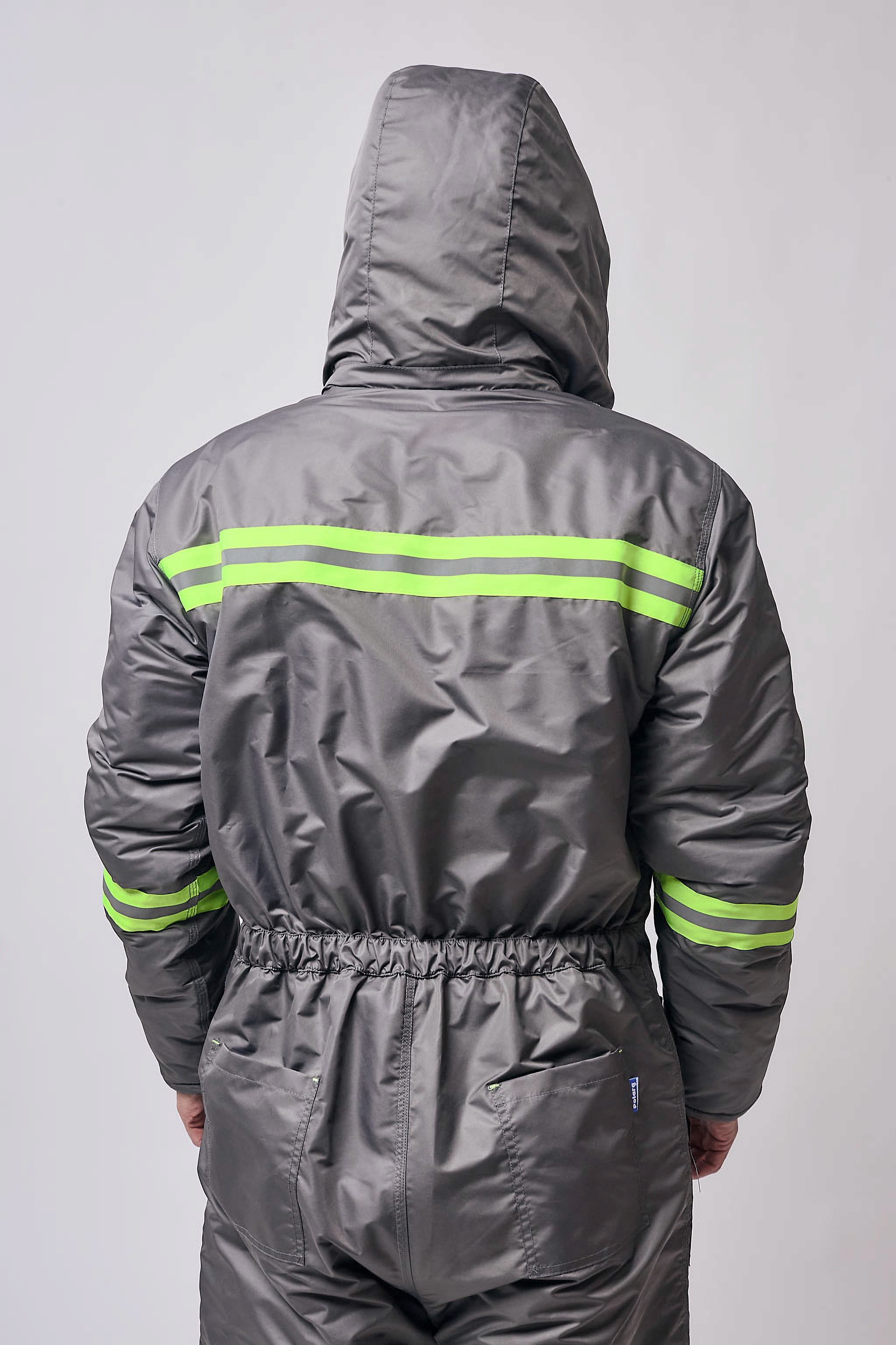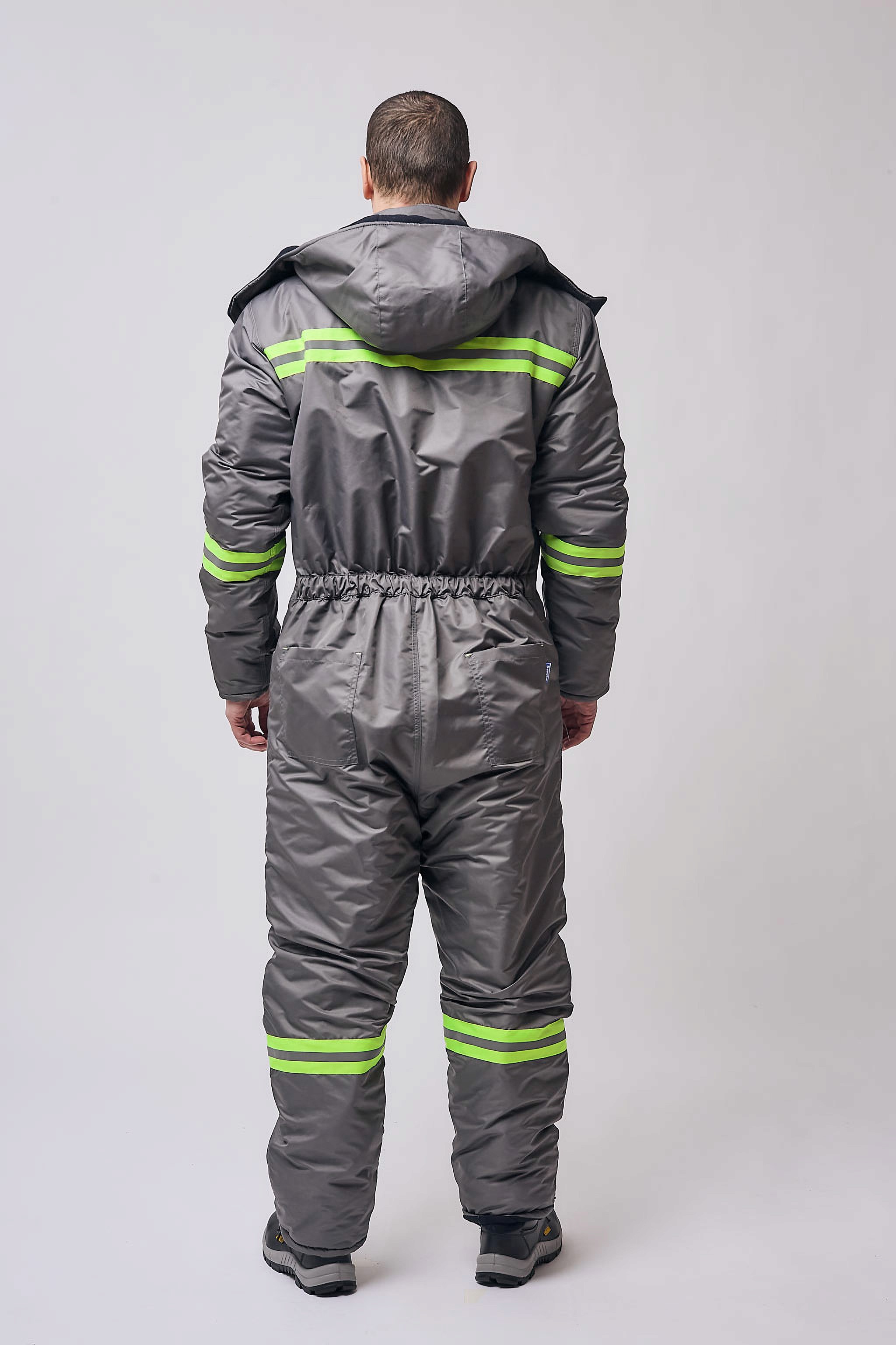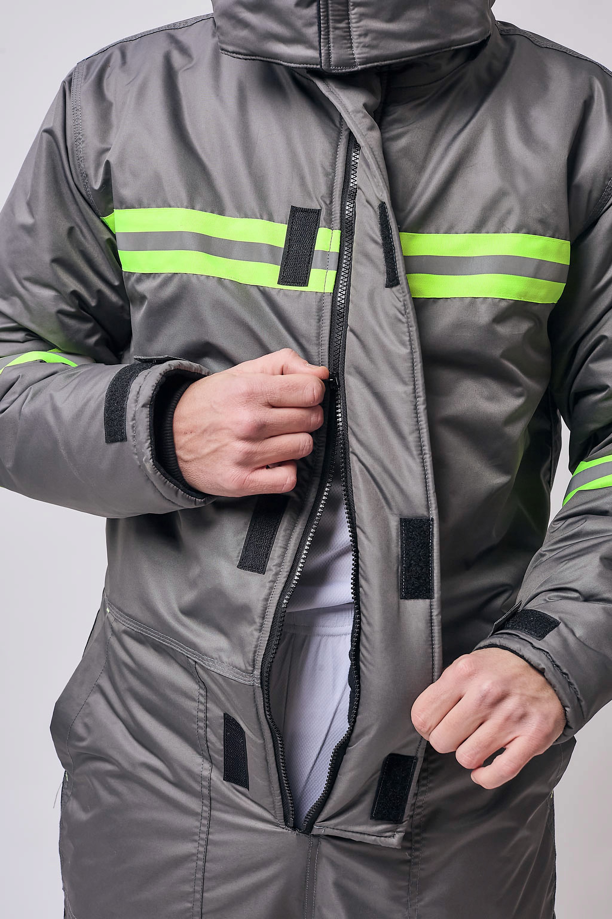 Mameluco térmico de manga larga con capucha desmontable y tapabocas con cierre de velcro. Acceso principal con cierre y carterón con cierre de velcro. Puños ajustables con velcro y cintura trasera elastizada. Presenta cintas reflectivas amarillo y gris 360° en brazos, piernas, delantero y trasero. Diseñado para ofrecer abrigo integral, resistencia y máxima visibilidad en condiciones de trabajo severas.