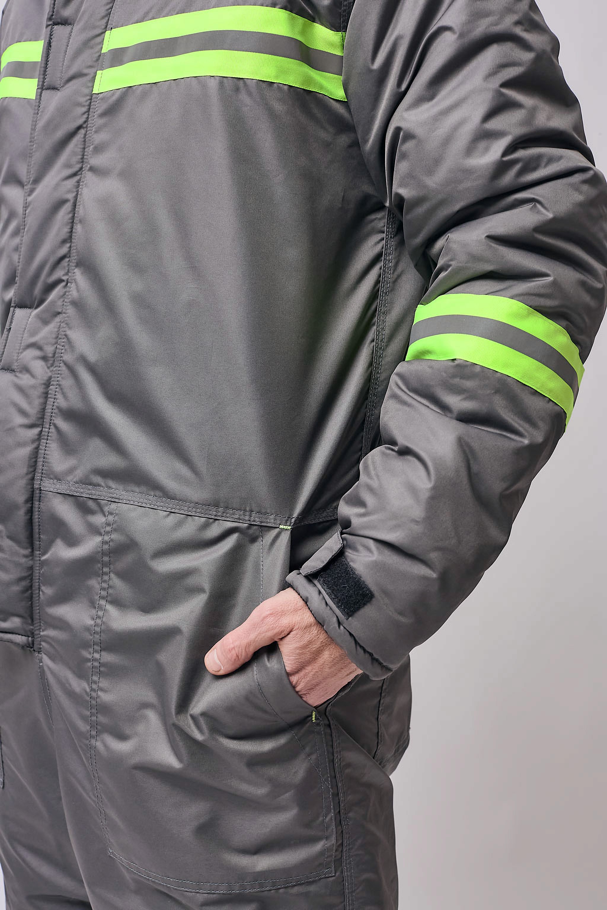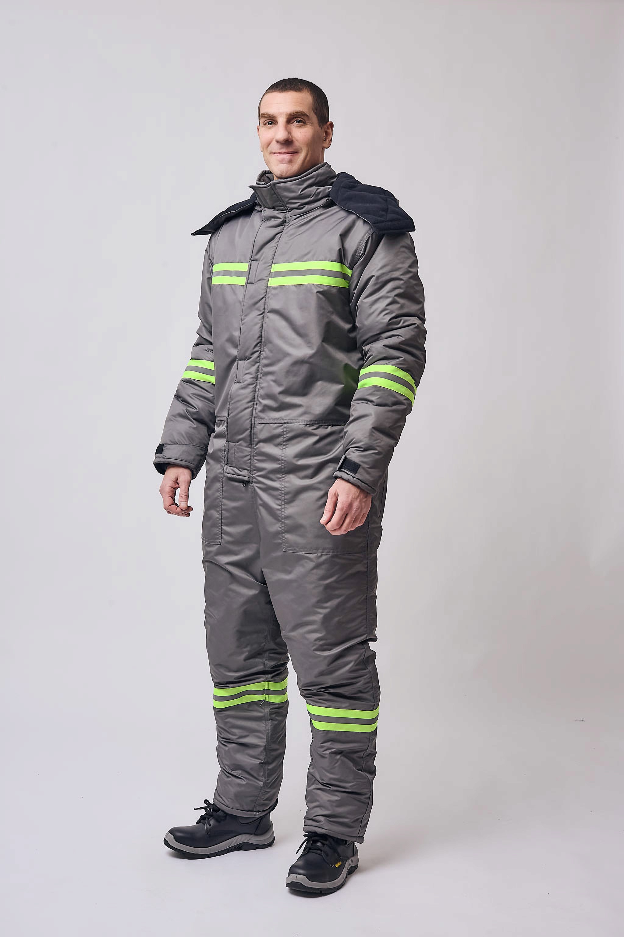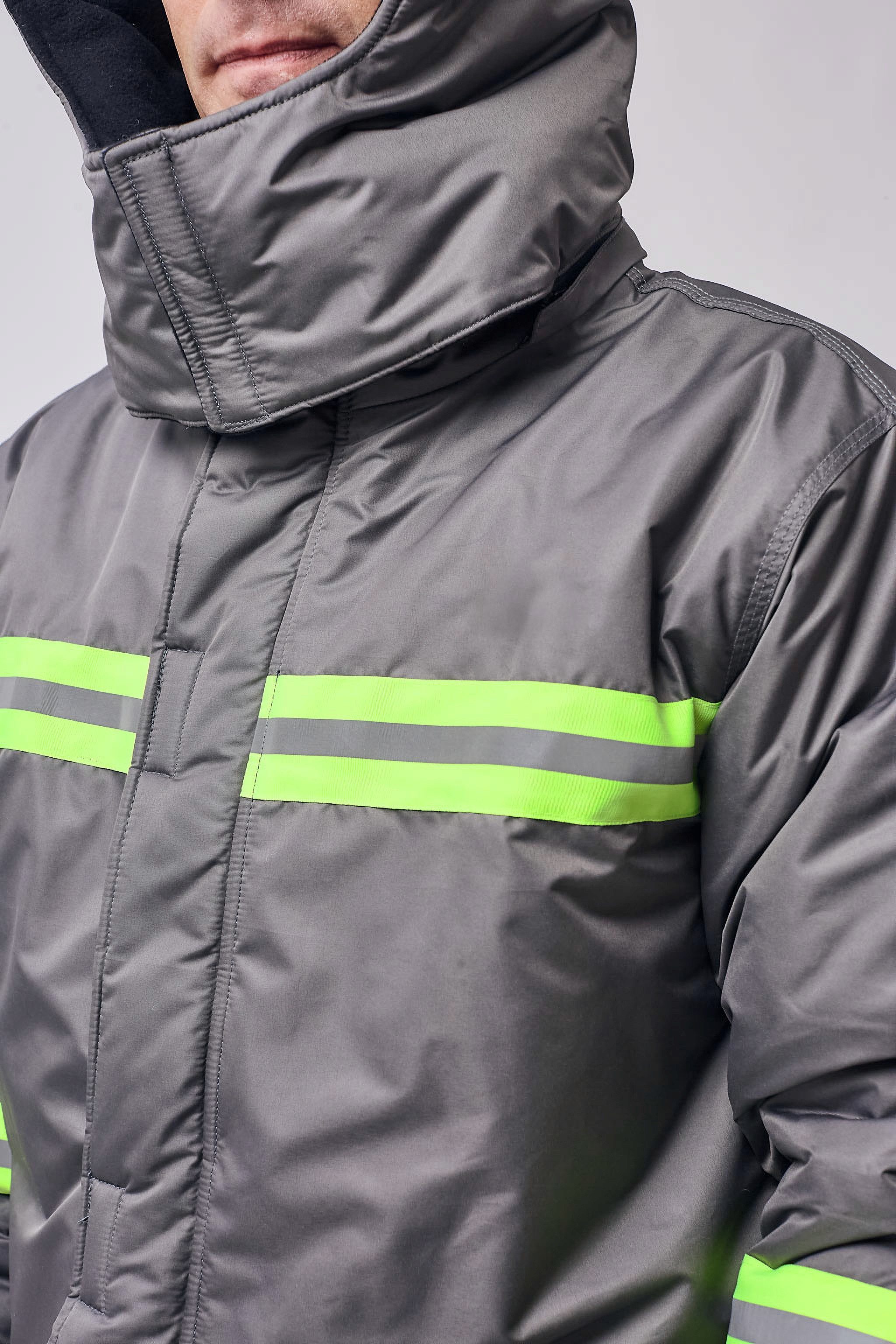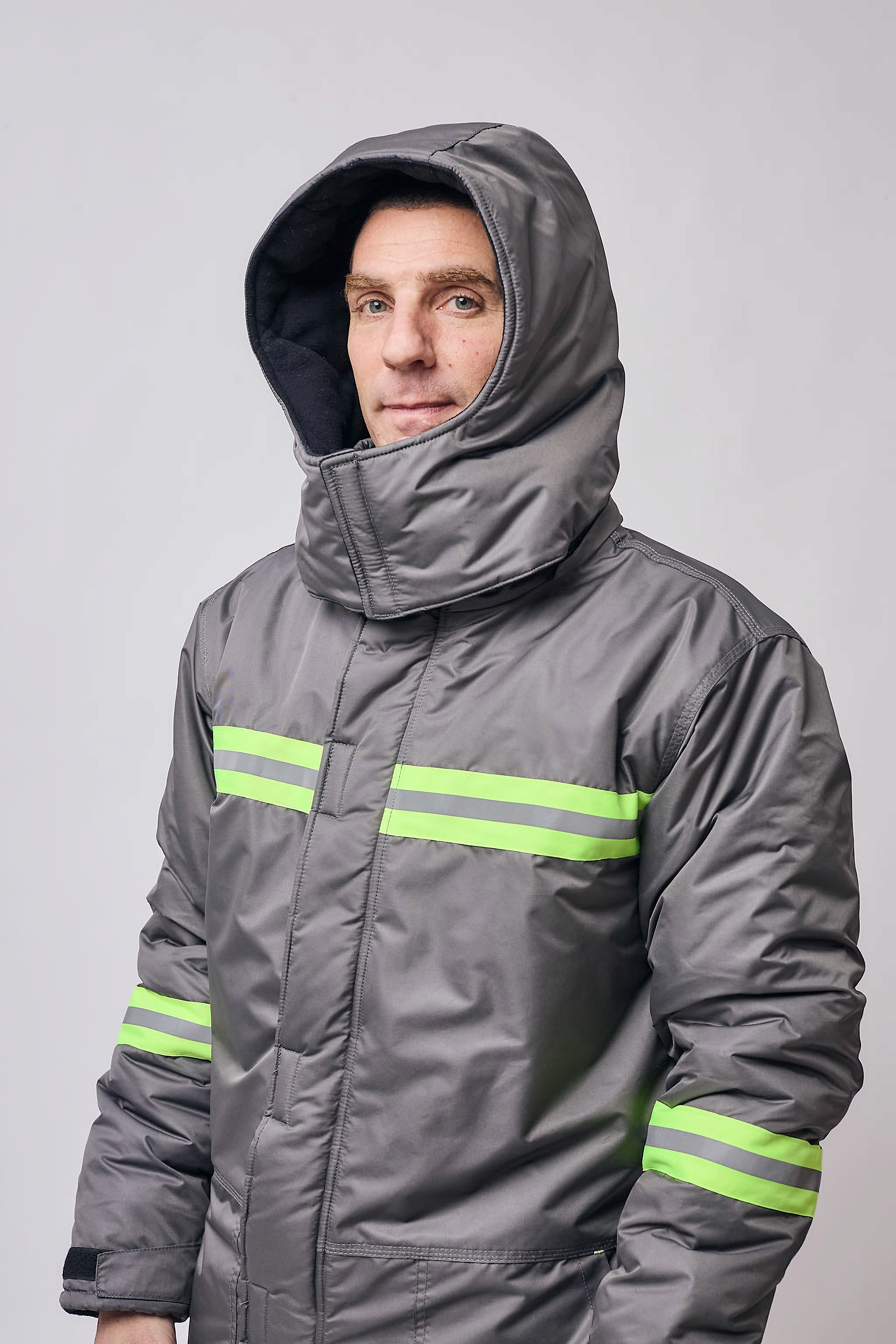 Mameluco térmico de manga larga con capucha desmontable y tapabocas con cierre de velcro. Acceso principal con cierre y carterón con cierre de velcro. Puños ajustables con velcro y cintura trasera elastizada. Presenta cintas reflectivas amarillo y gris 360° en brazos, piernas, delantero y trasero. Diseñado para ofrecer abrigo integral, resistencia y máxima visibilidad en condiciones de trabajo severas.