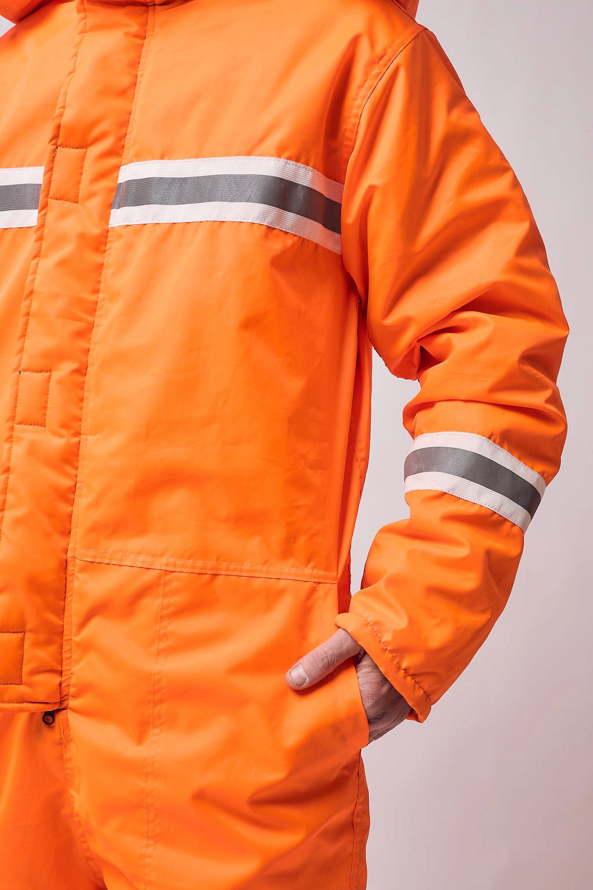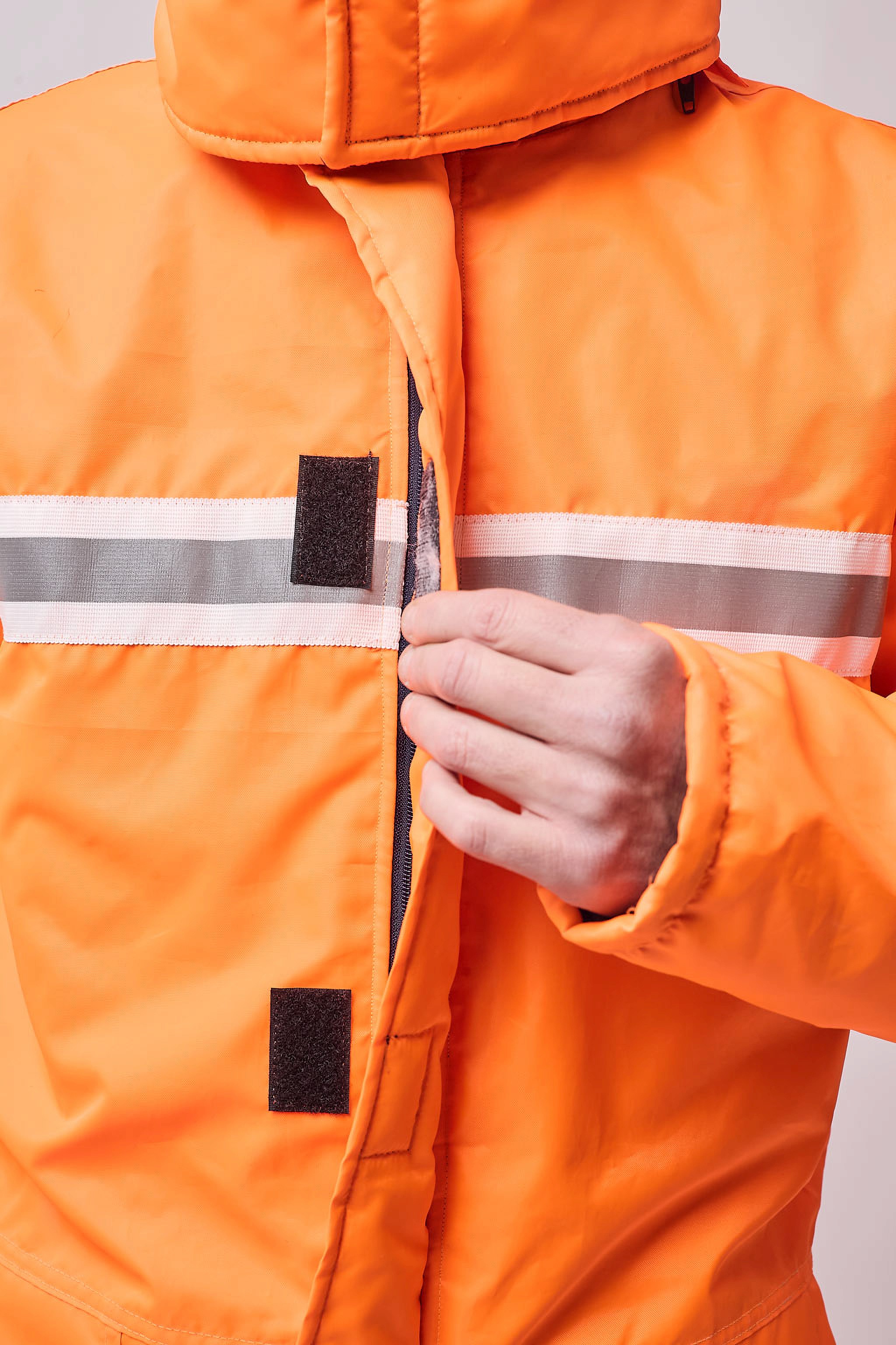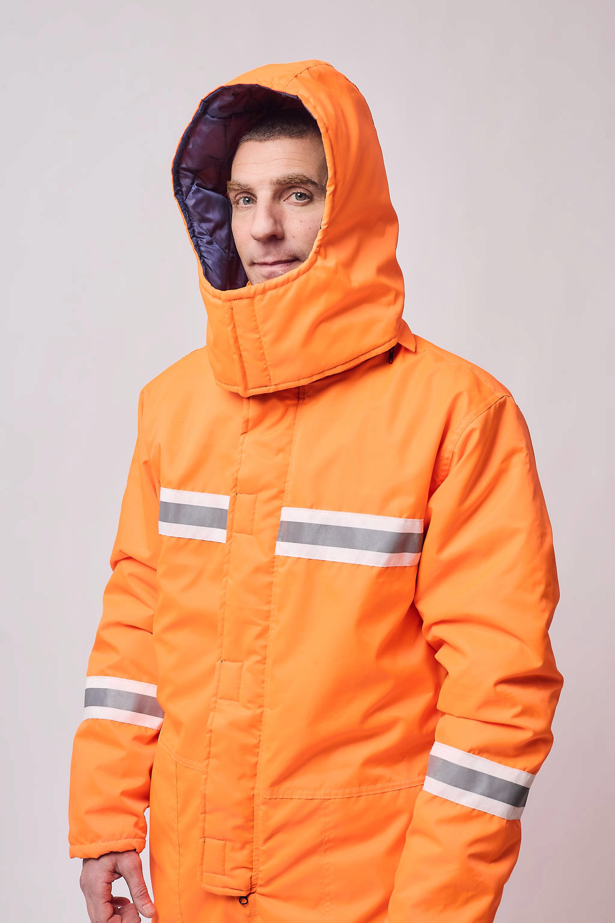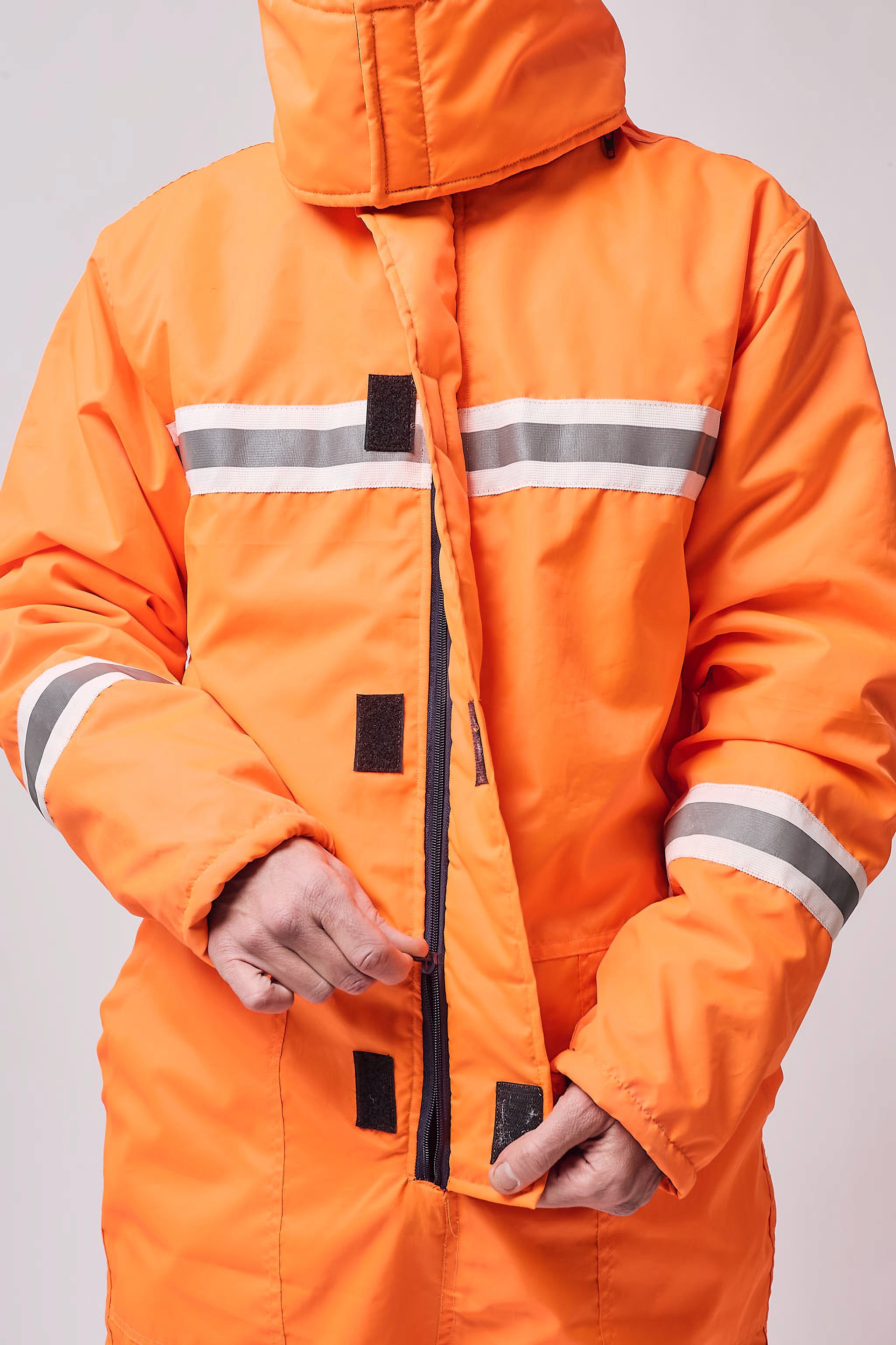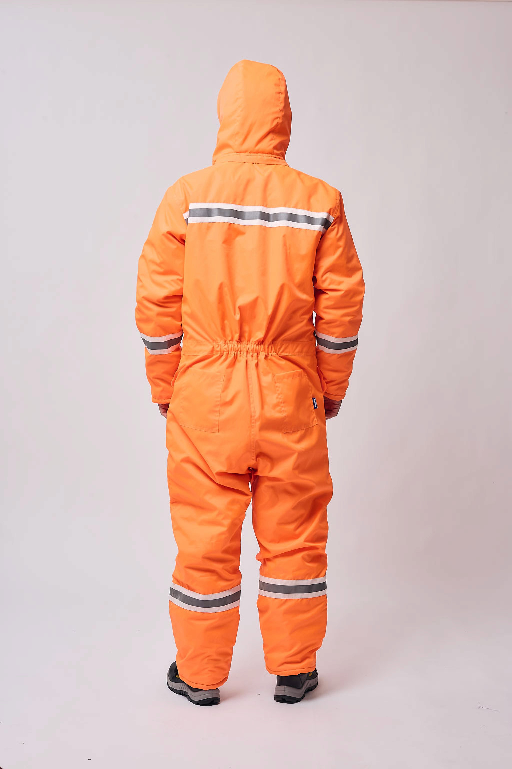 Mameluco térmico de manga larga con capucha desmontable y tapabocas con cierre de velcro. Acceso principal con cierre y carterón con cierre de velcro. Puños ajustables con velcro y cintura trasera elastizada. Presenta cintas reflectivas amarillo y gris 360° en brazos, piernas, delantero y trasero. Diseñado para ofrecer abrigo integral, resistencia y máxima visibilidad en condiciones de trabajo severas.